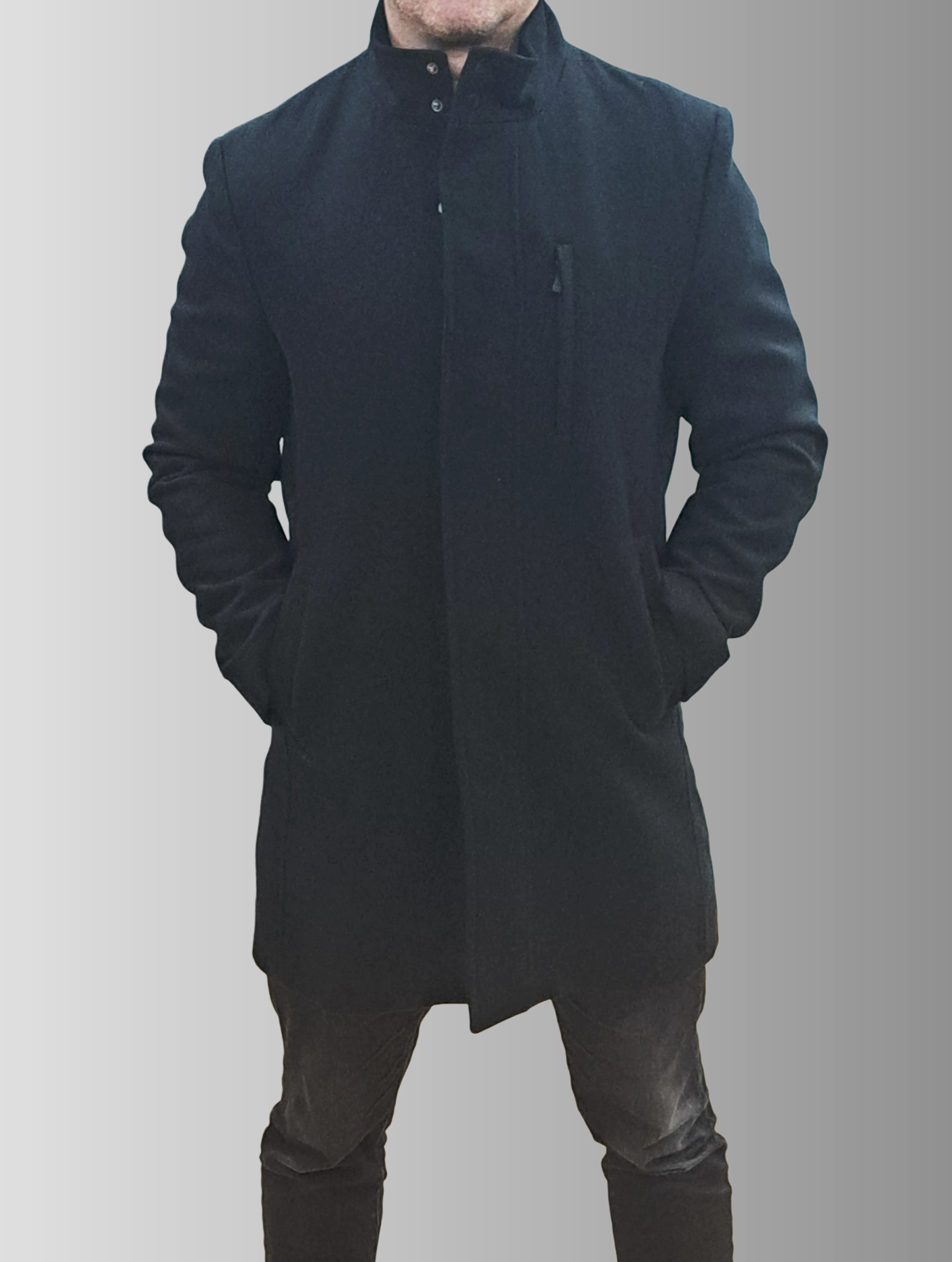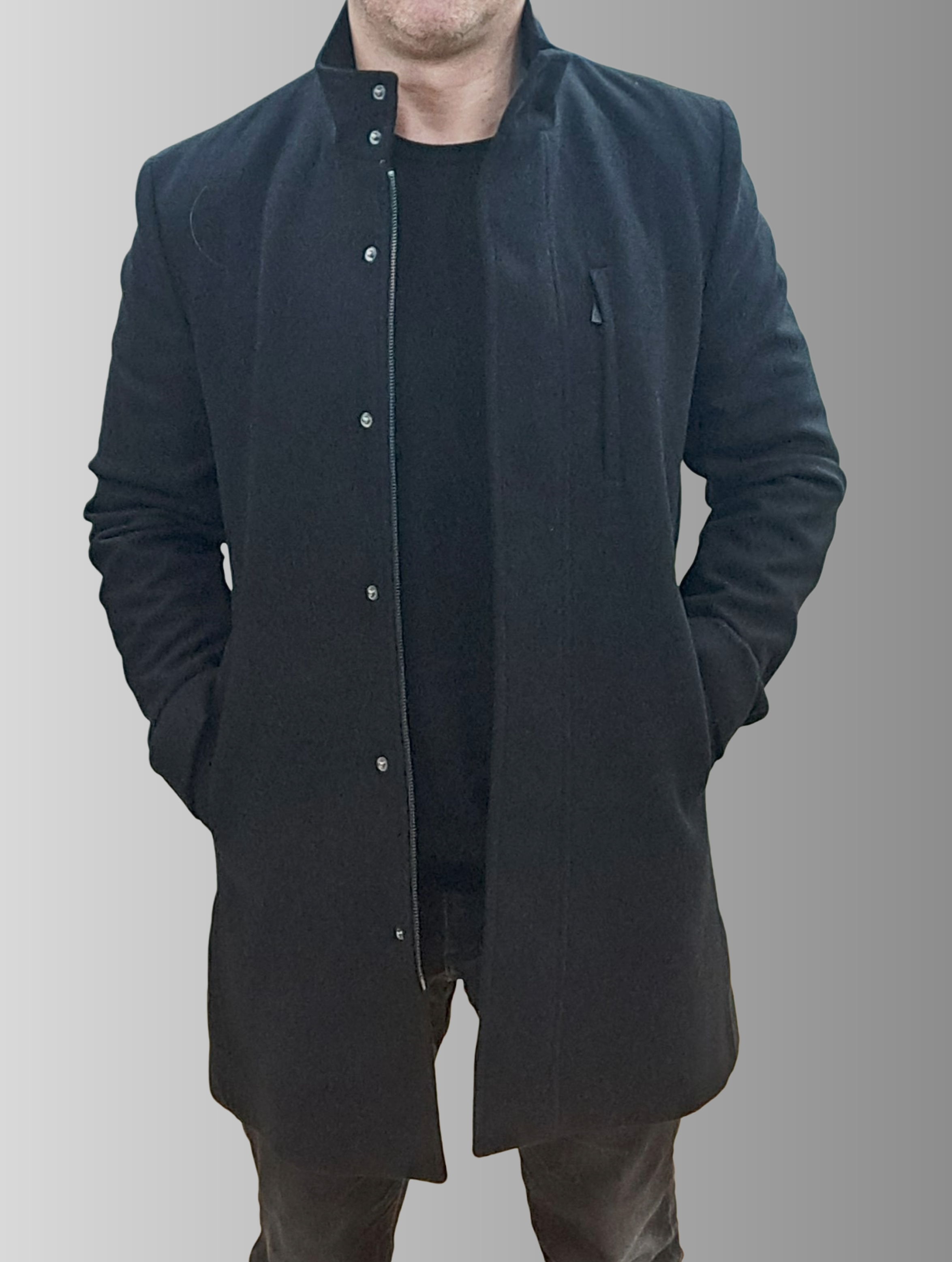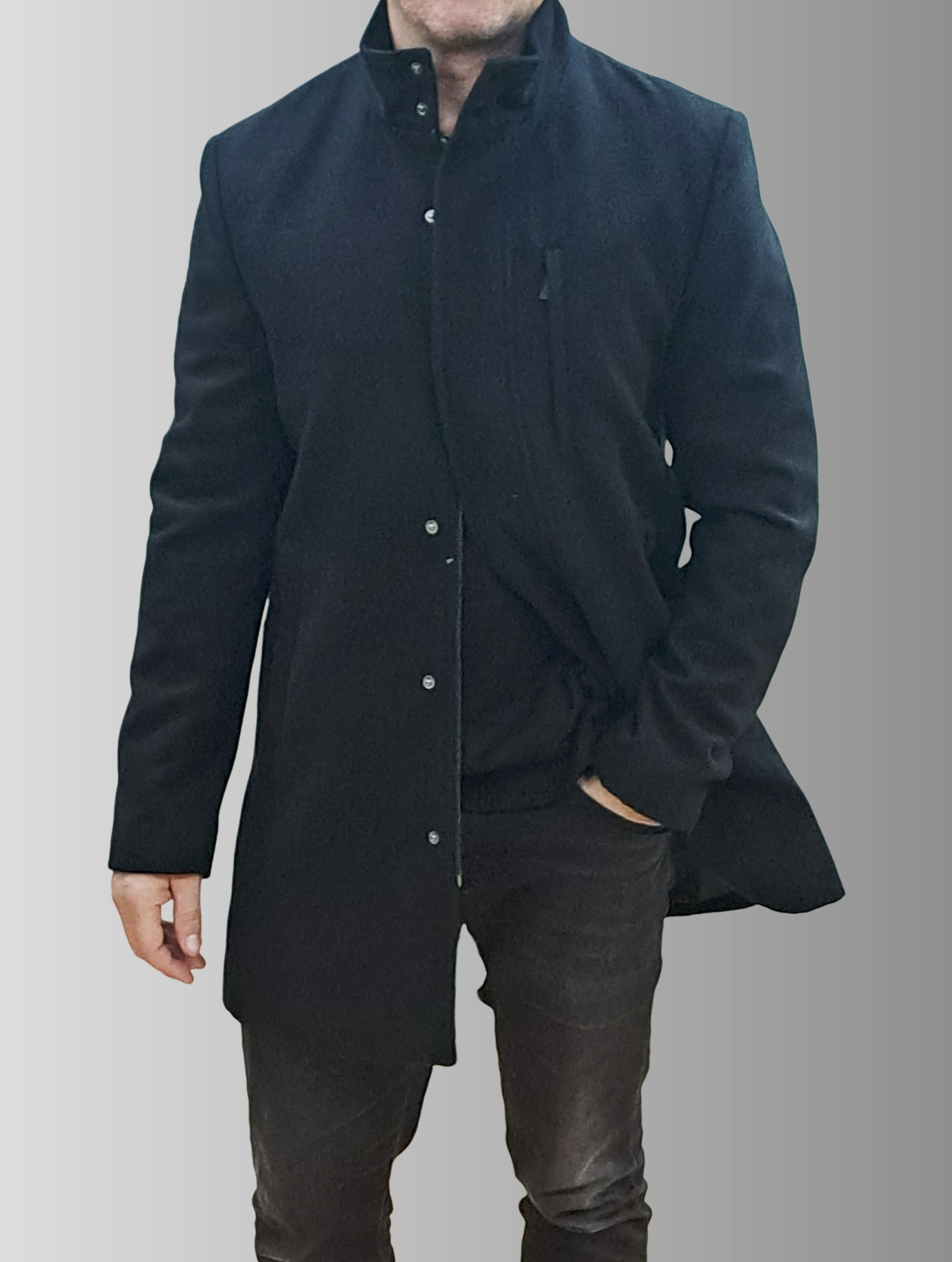 The colour black is exclusively here. Long design. Wool/pol mix fabric. Funnel neck. Concealed button fastening. Long sleeve. Two side pockets. Back slit. Quilted inner lining. Interior pocket.