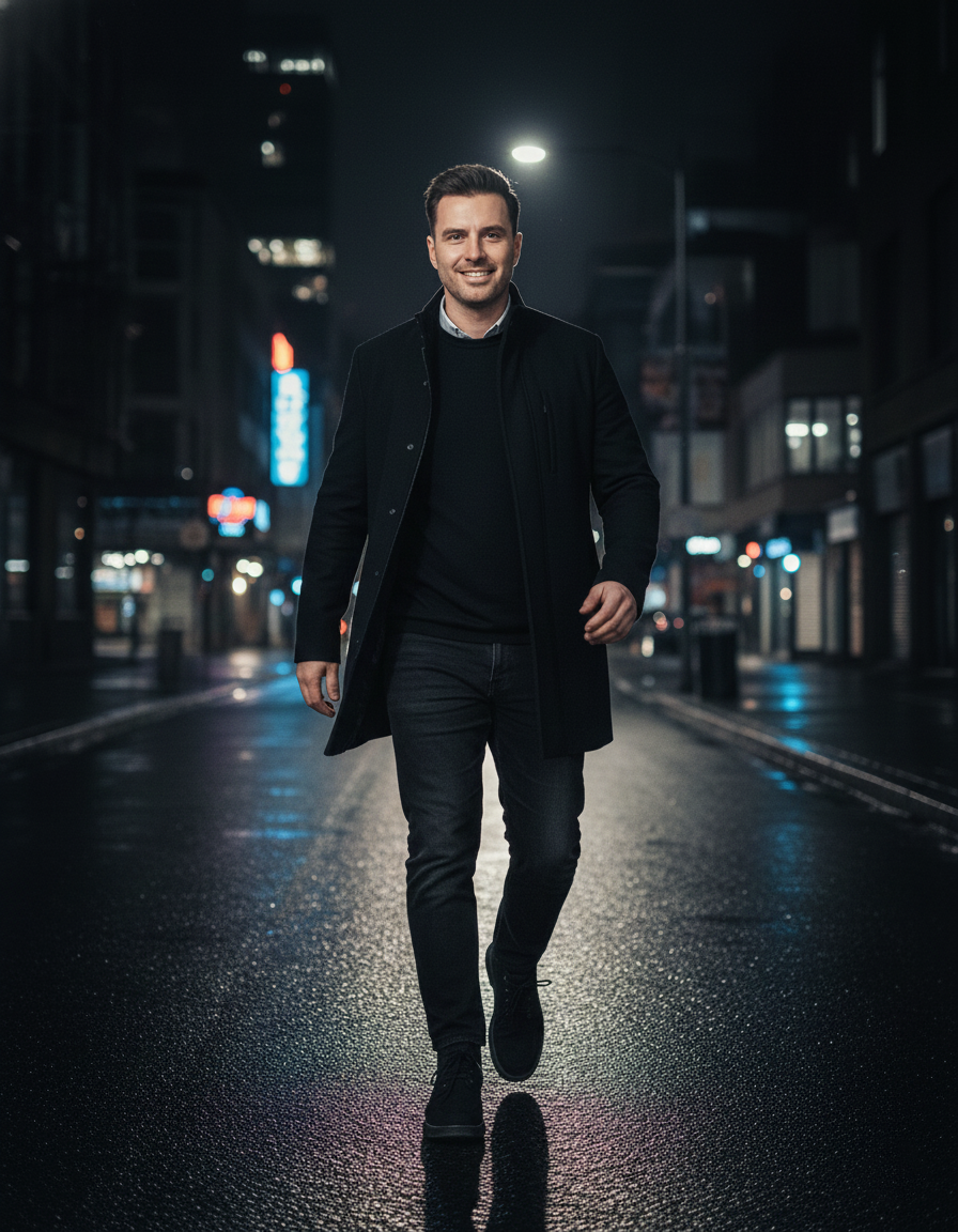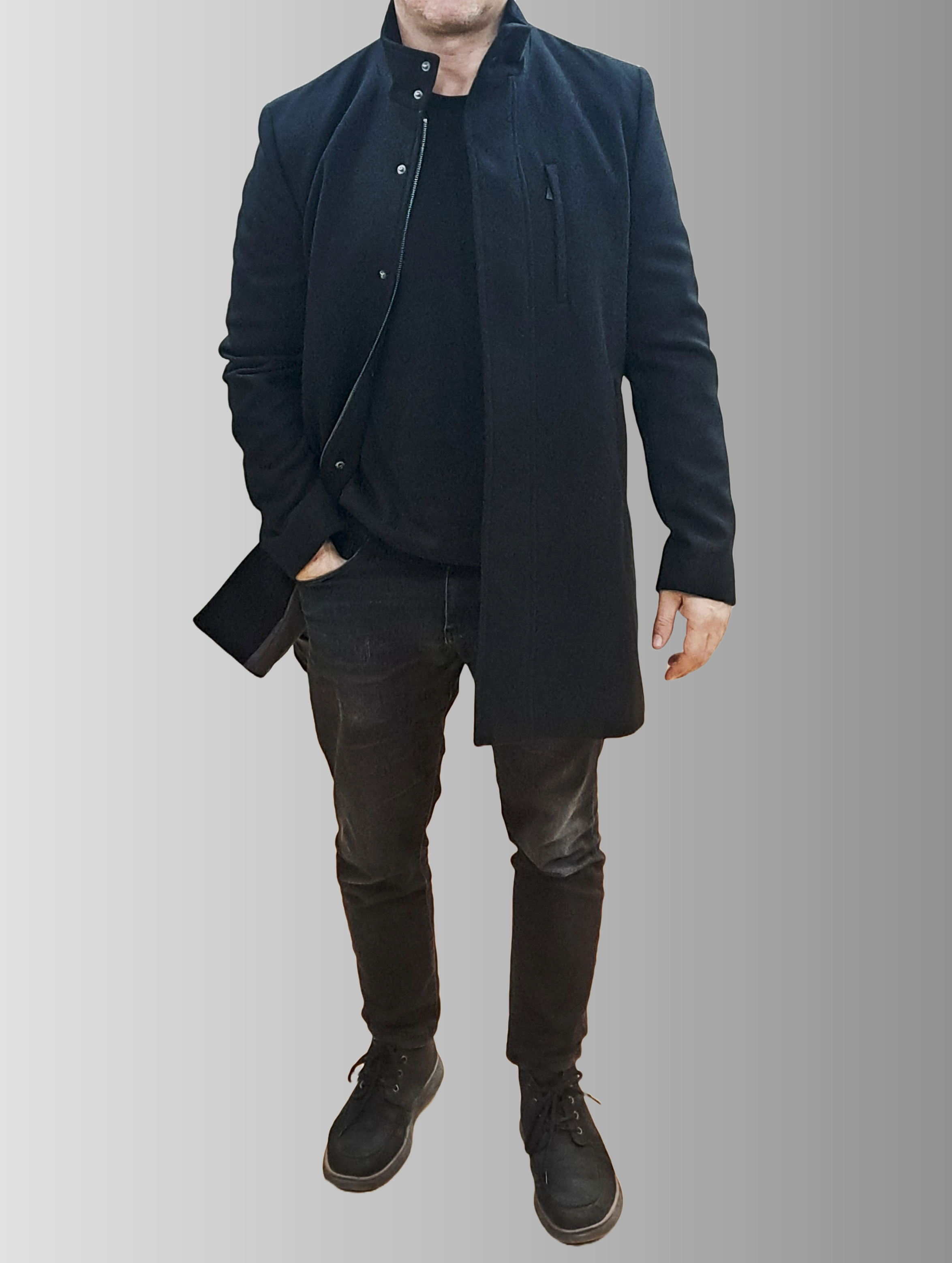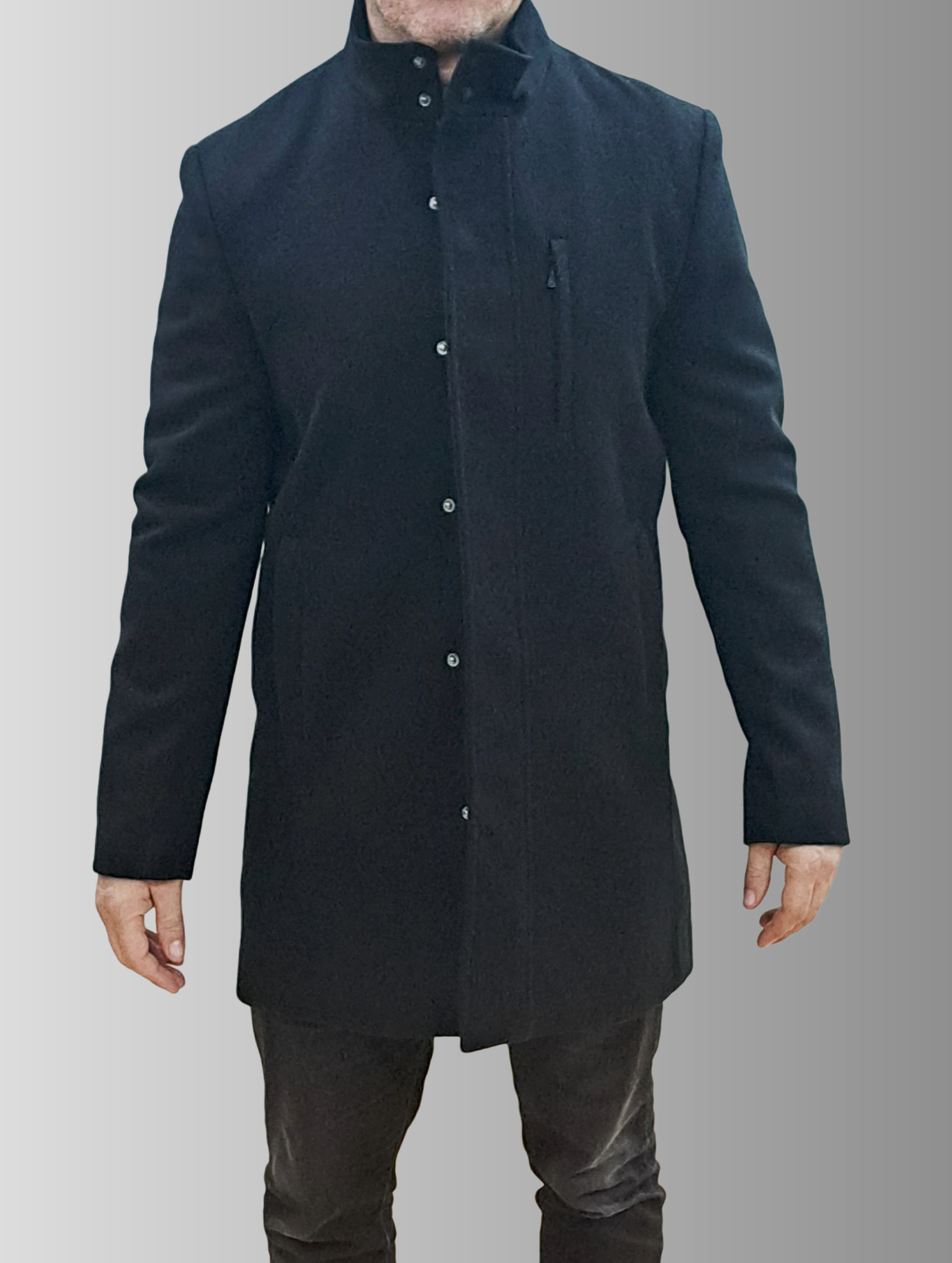 The colour black is exclusively here. Long design. Wool/pol mix fabric. Funnel neck. Concealed button fastening. Long sleeve. Two side pockets. Back slit. Quilted inner lining. Interior pocket.