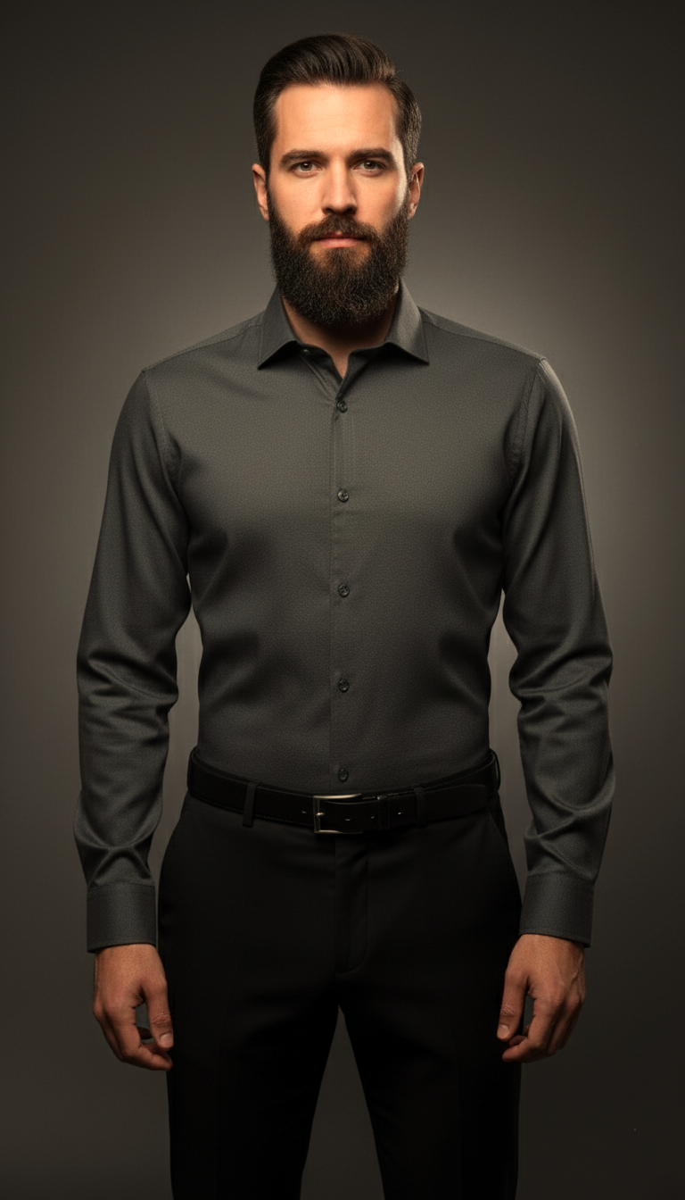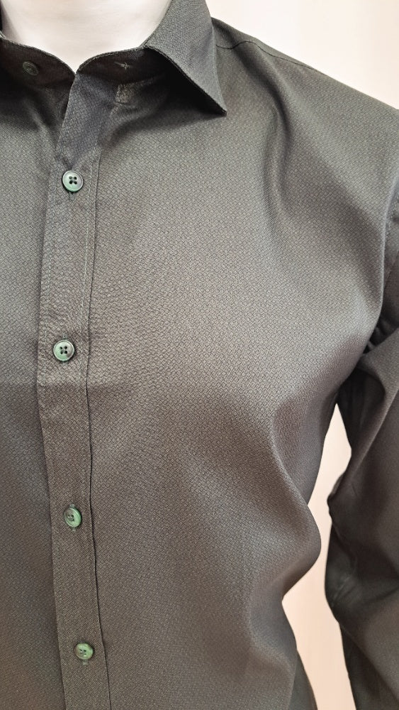 This dark green slim-fit shirt combines comfort and style with its soft cotton fabric. Designed with a classic shirt collar and long sleeves featuring buttoned cuffs, it offers a polished look suitable for any occasion. The button-front closure and rounded base add a refined touch, making it an essential piece to elevate your wardrobe effortlessly.