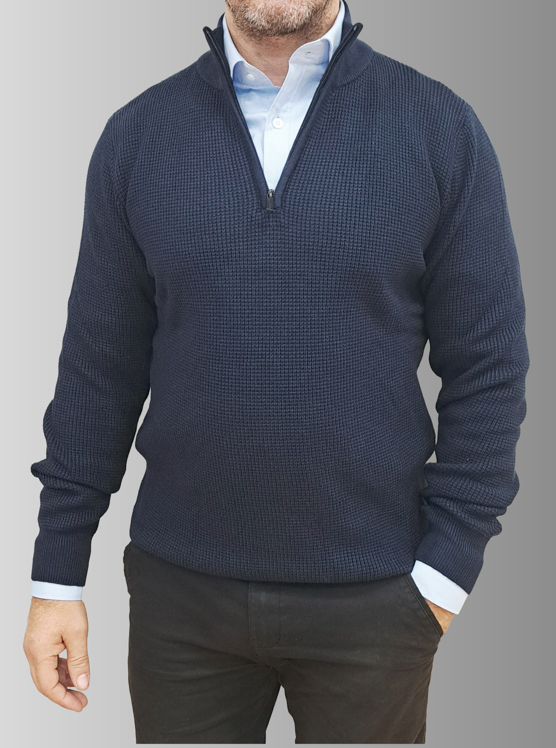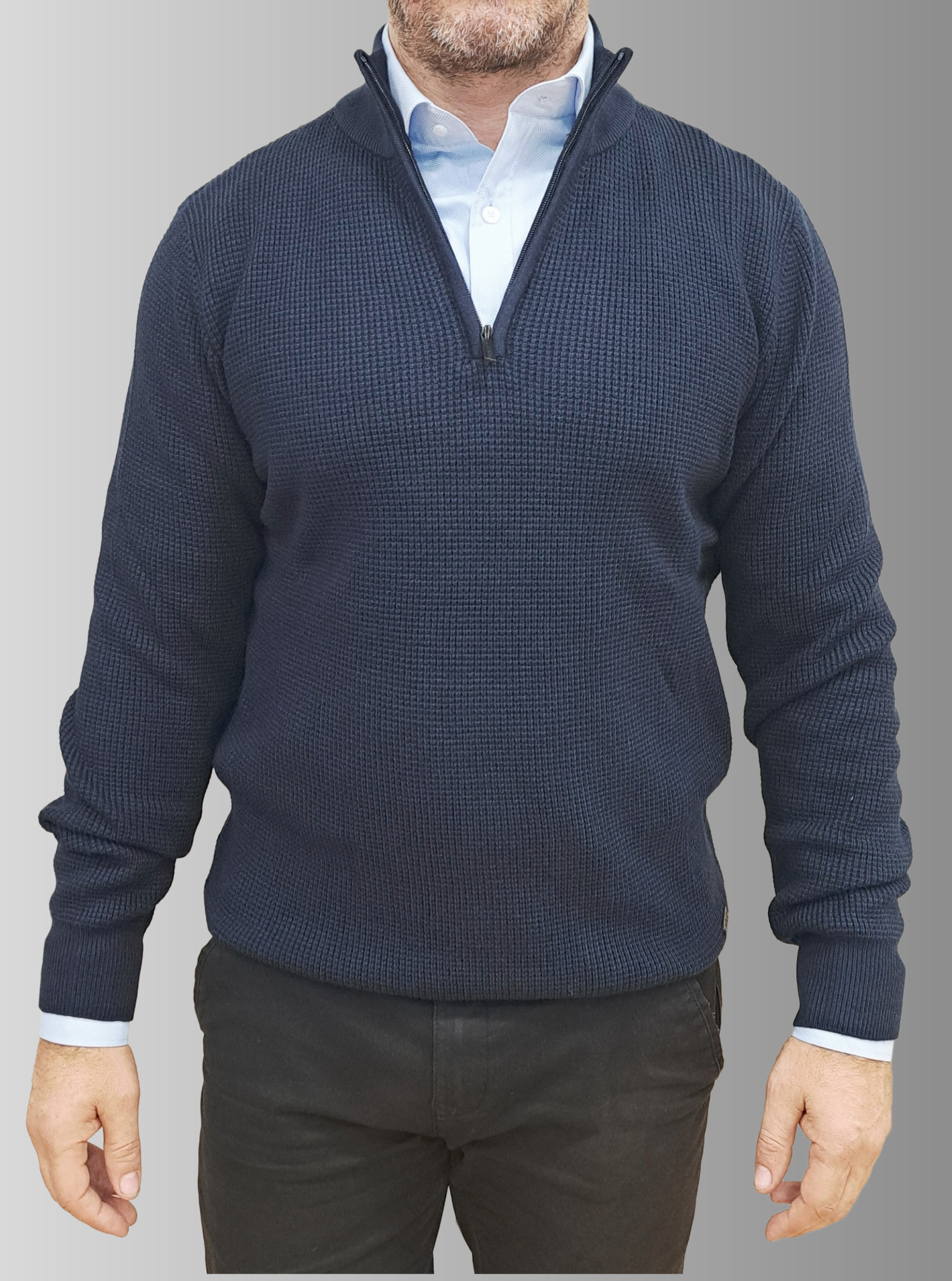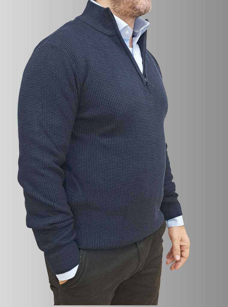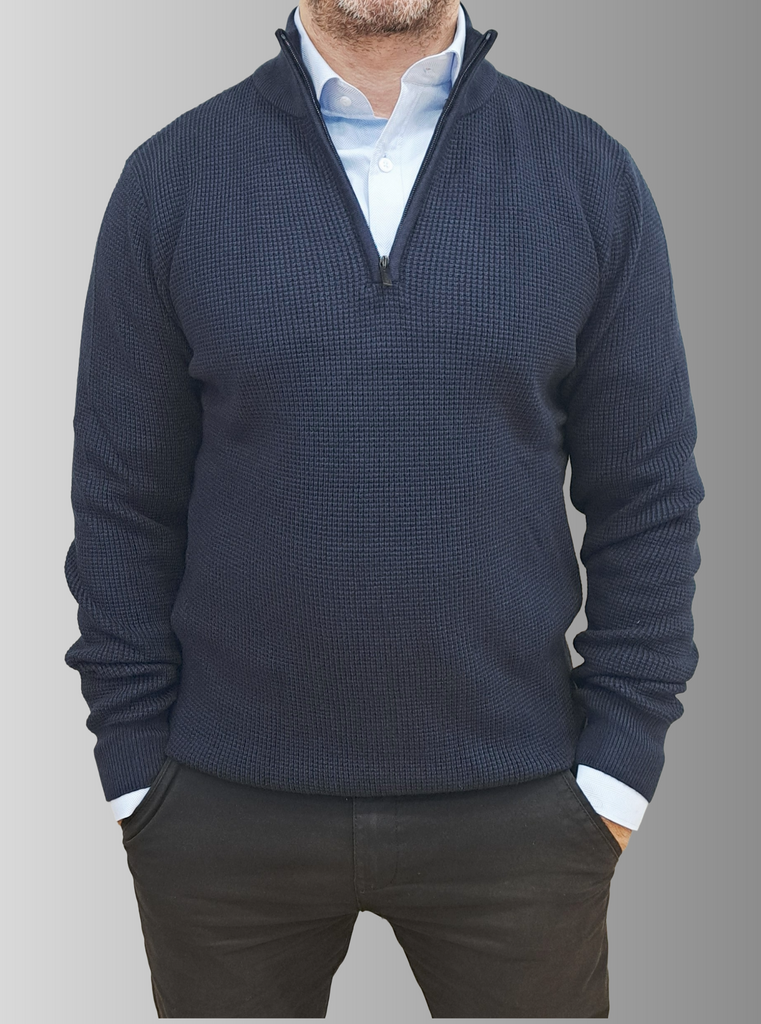 Elevate your everyday wardrobe with this versatile quarter-zip jumper, designed for effortless comfort and timeless style. Crafted in a rich navy blue, this knitted piece features a relaxed regular fit that works beautifully for casual outings or layered looks. The high neckline and front zip fastening offer practical styling flexibility, while long sleeves provide warmth through cooler months. Finished with ribbed trims for a polished silhouette, this jumper is the go-to layer you'll reach for again and again.