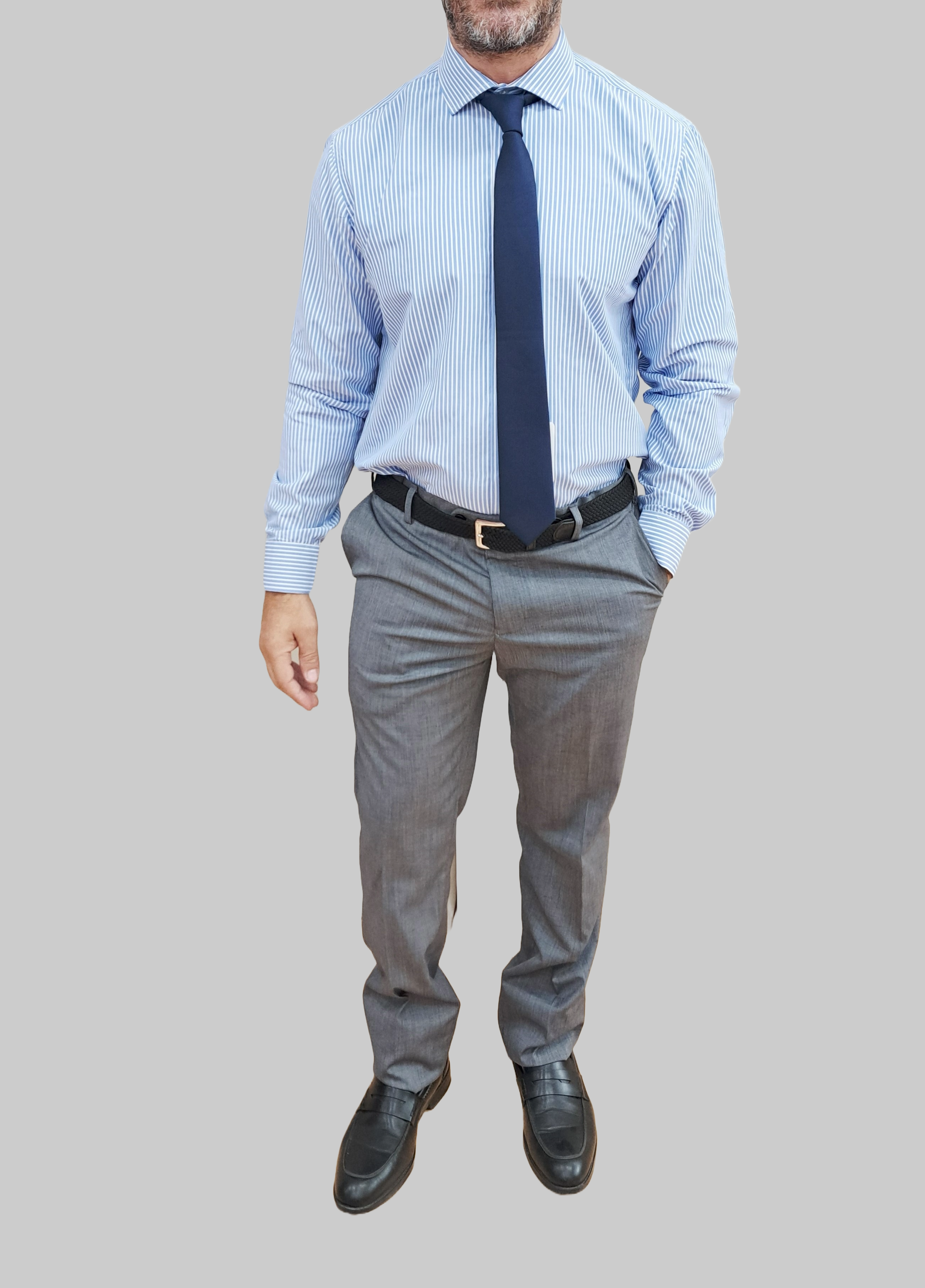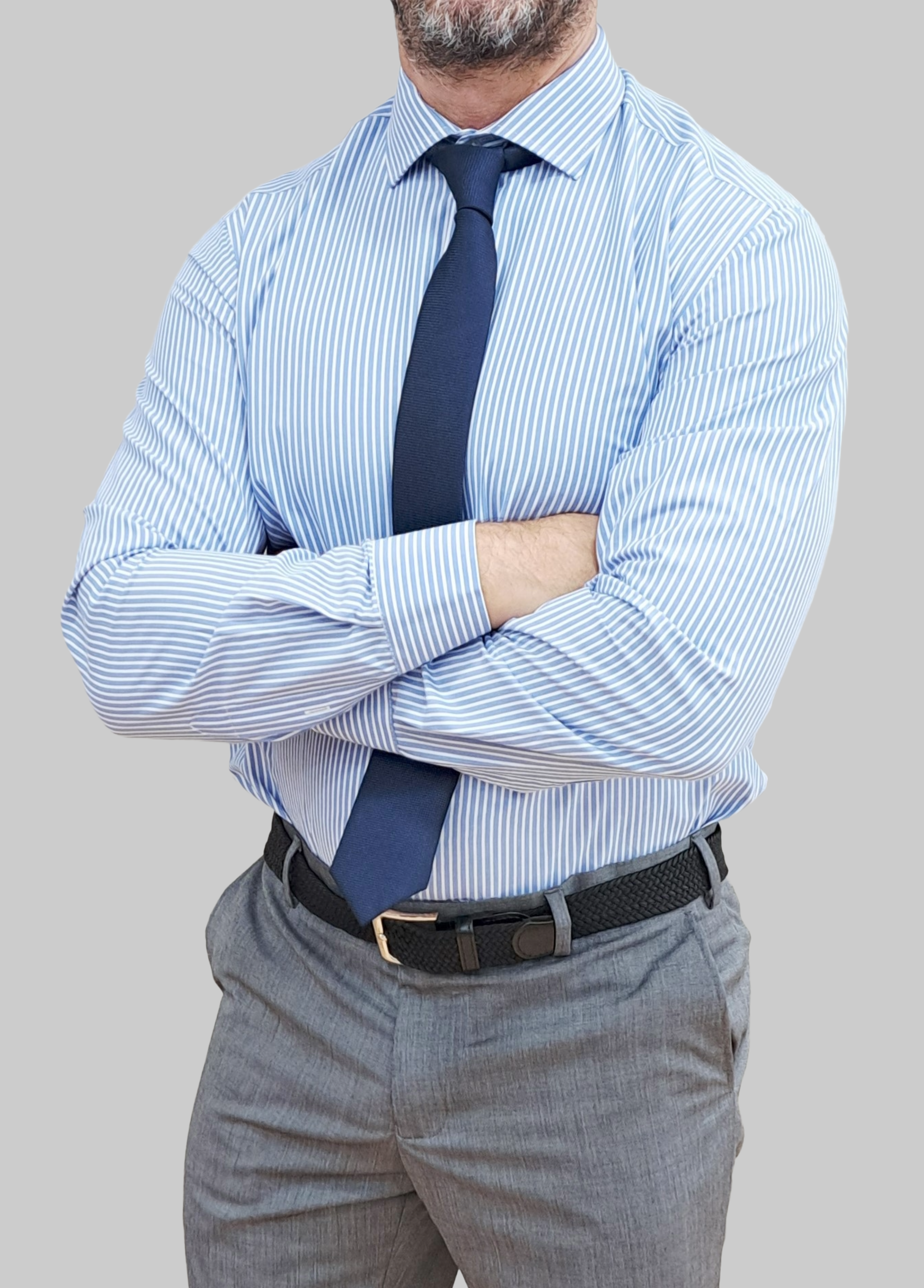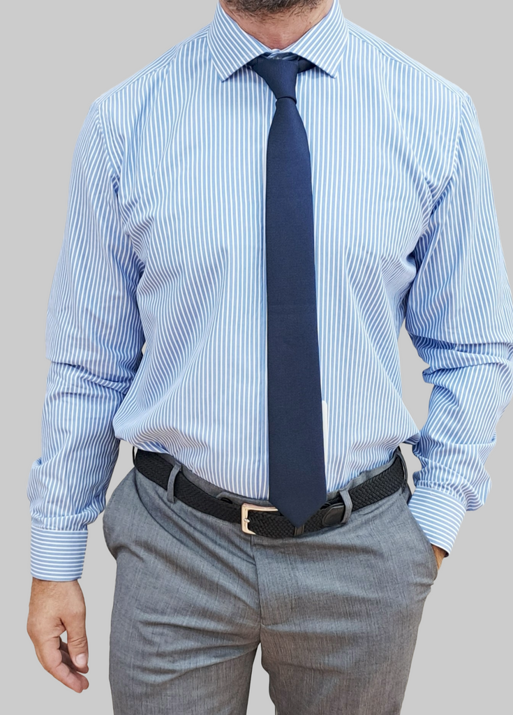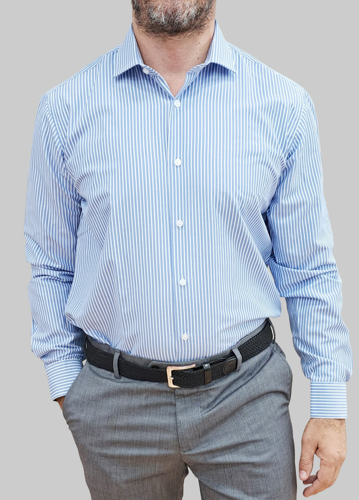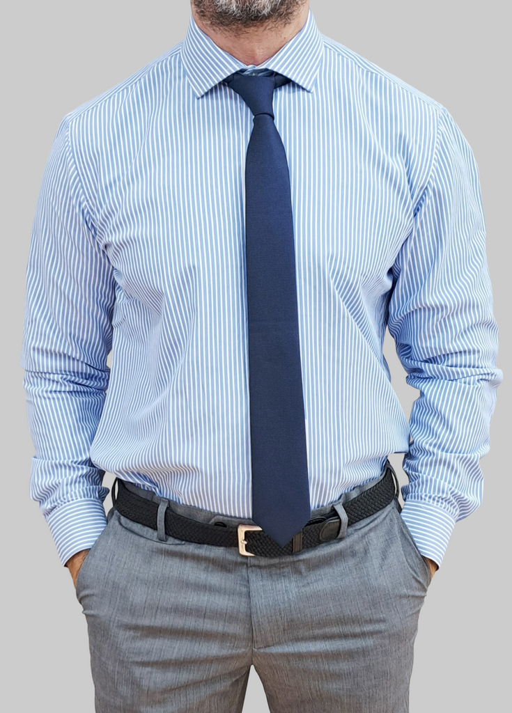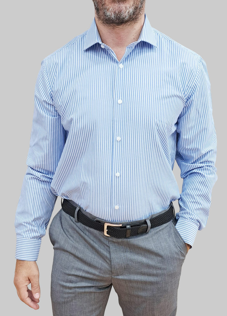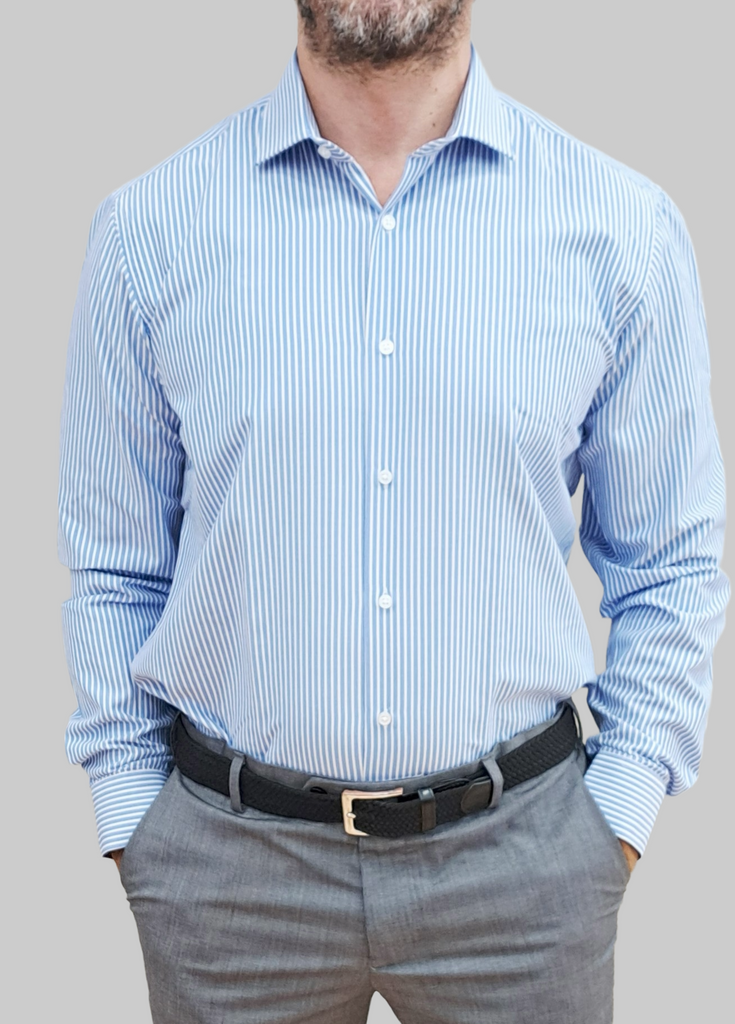This slim-fit shirt in blue features a lightweight 100% cotton fabric with a classic stripe design for a refined look. The shirt-style V-neck collar and long sleeves provide a tailored silhouette, while the rounded base enhances comfort and movement. Finished with a front button closure and easy-iron fabric, it offers both style and practicality for a polished appearance throughout the day.
