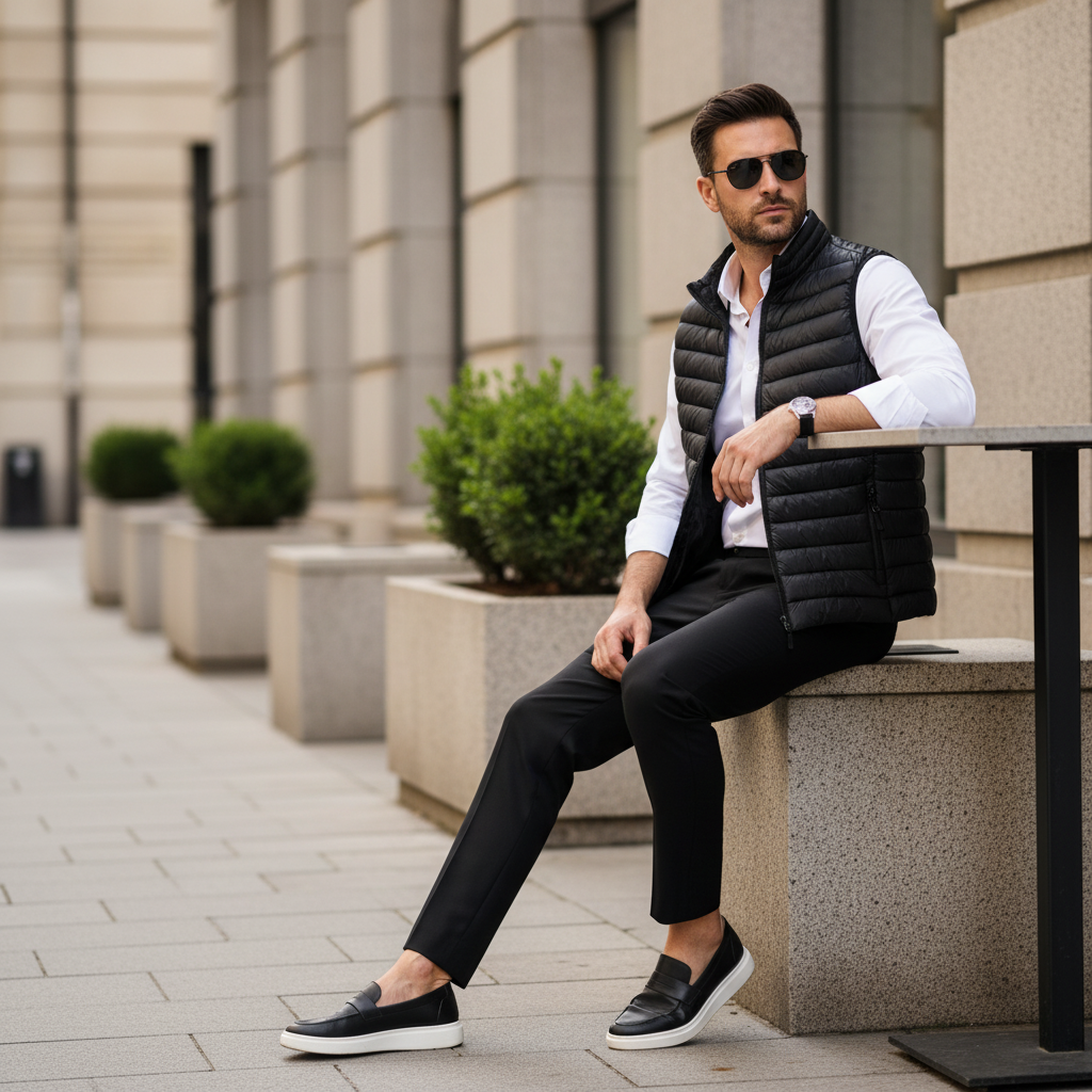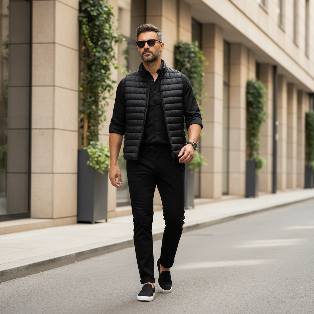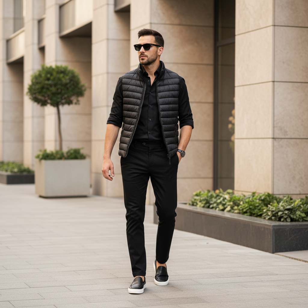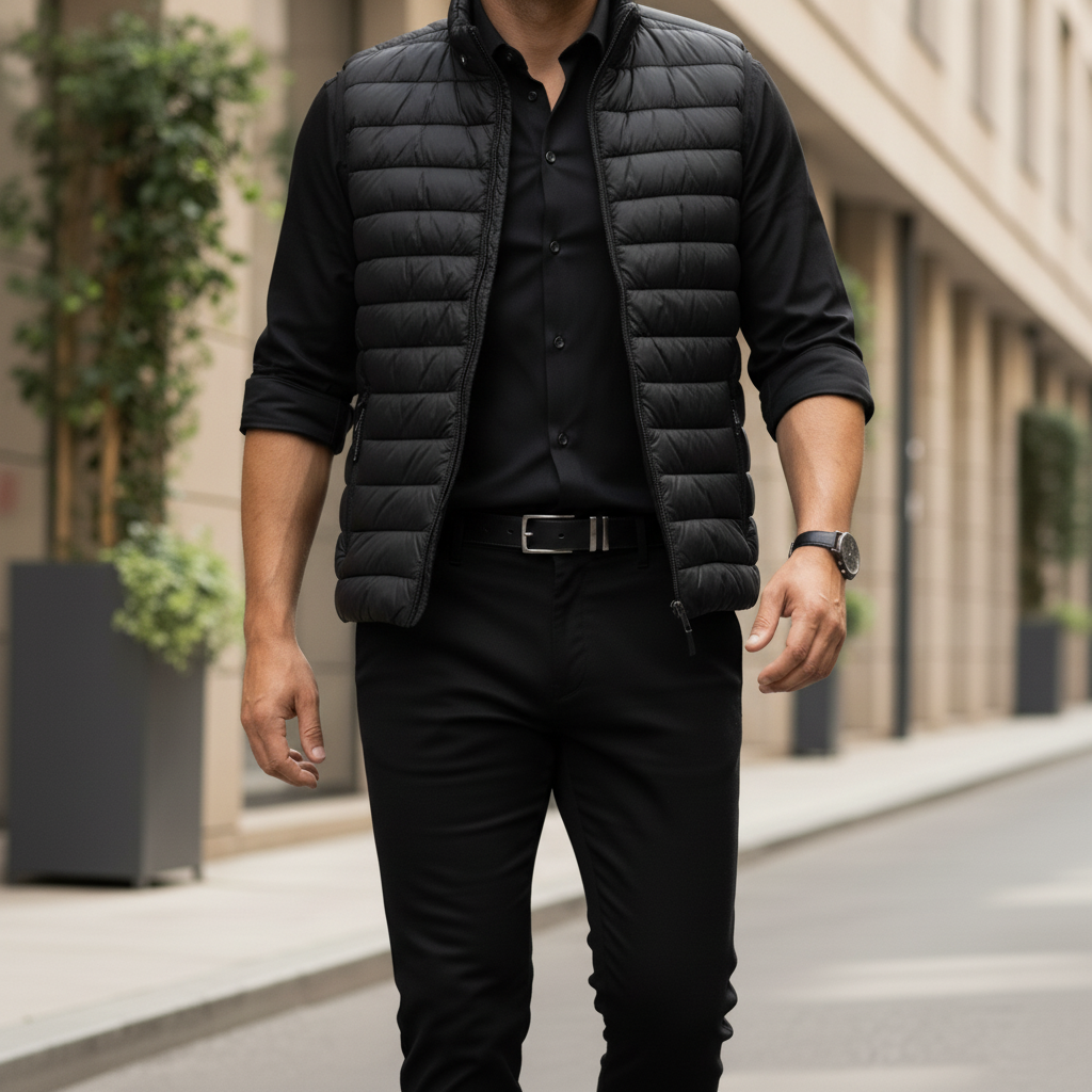 Καπιτονέ γιλέκο σε στενή γραμμή, από τεχνικό ύφασμα που απωθεί το νερό κατά την επαφή. Το ύφασμα σας βοηθά να παραμένετε στεγνοί κατά τη διάρκεια σύντομων περιόδων έκθεσης σε ελαφριά ψιλόβροχα. μαύρο χρώμα
