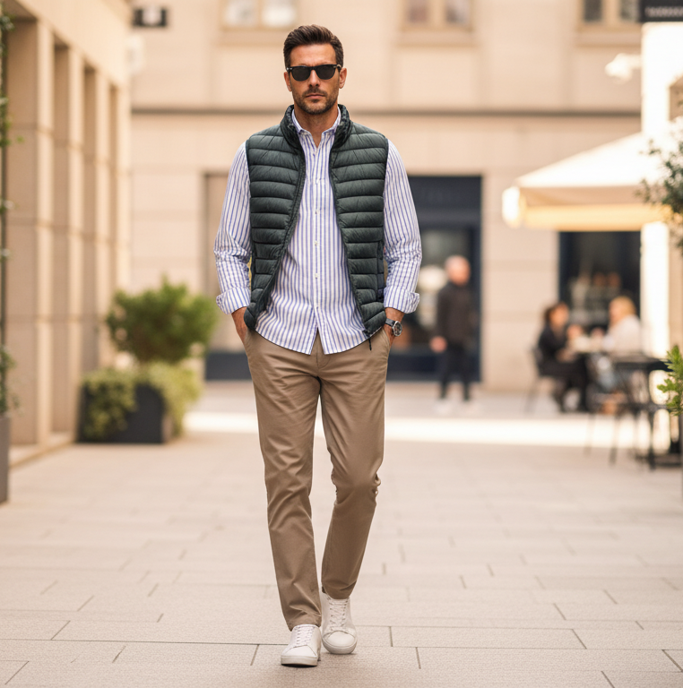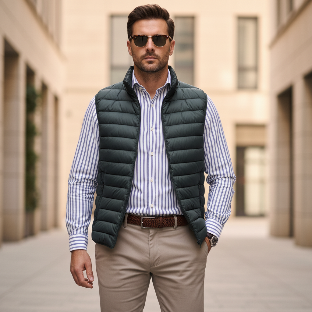 Καπιτονέ γιλέκο σε στενή γραμμή, από τεχνικό ύφασμα που απωθεί το νερό κατά την επαφή. Το ύφασμα σας βοηθά να παραμένετε στεγνοί κατά τη διάρκεια σύντομων περιόδων έκθεσης σε ελαφριά ψιλόβροχα. πράσινο χρώμα