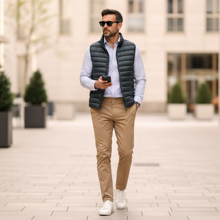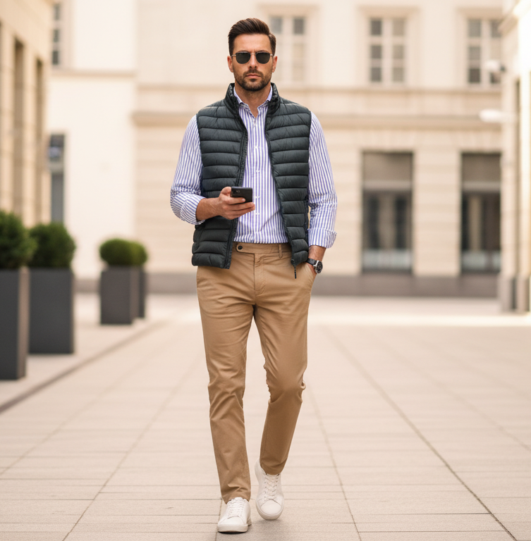 Όρθιος γιακάς και χωρίς μανίκια. Τσέπες φιλέτο στους γοφούς. Κλείσιμο μπροστά με φερμουάρ.
