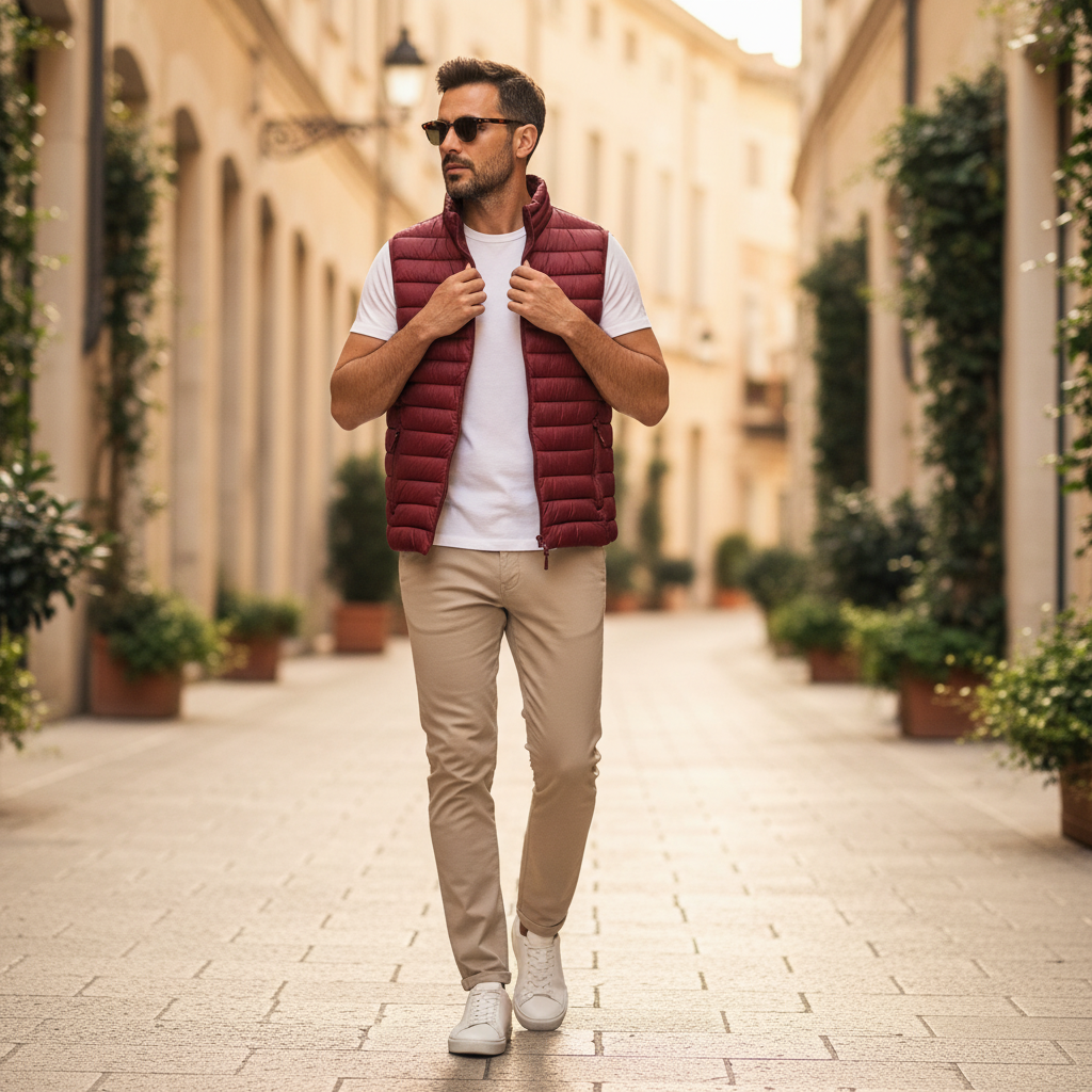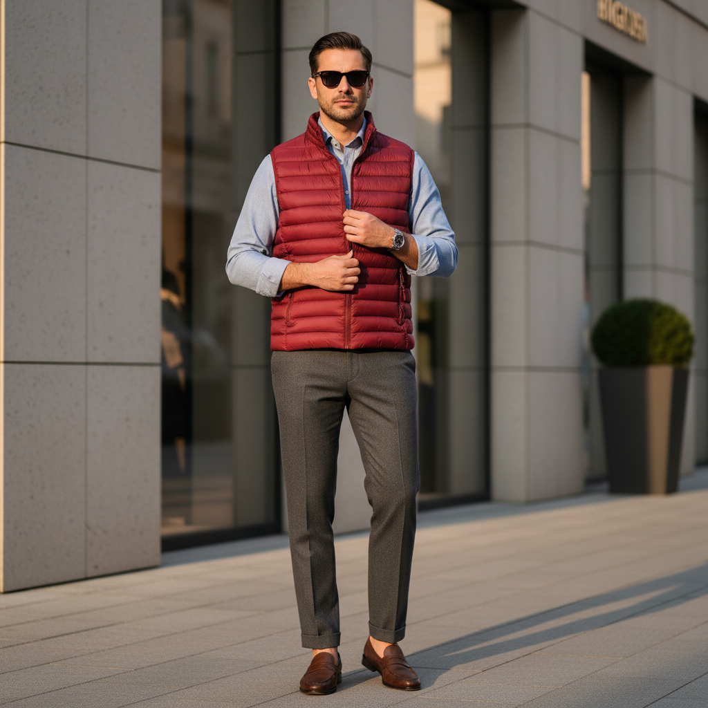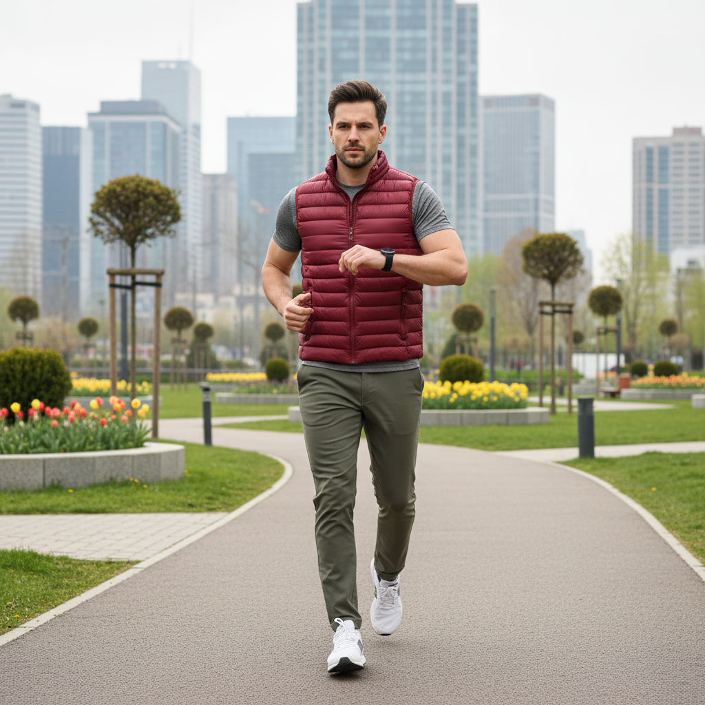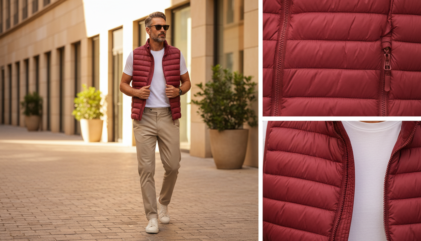 Καπιτονέ γιλέκο σε στενή γραμμή, από τεχνικό ύφασμα που απωθεί το νερό κατά την επαφή. Το ύφασμα σας βοηθά να παραμένετε στεγνοί κατά τη διάρκεια σύντομων περιόδων έκθεσης σε ελαφριά ψιλόβροχα. κόκκινο χρώμα