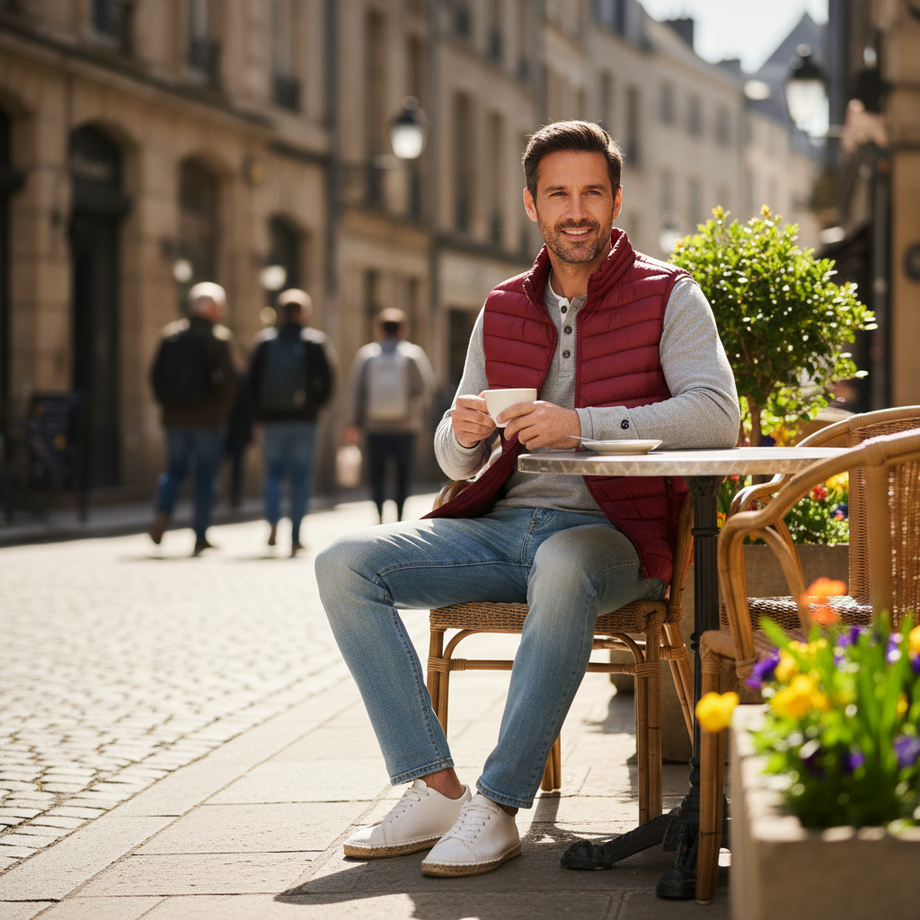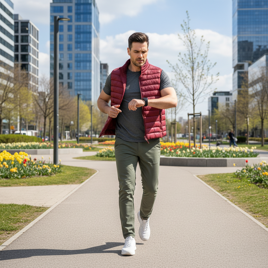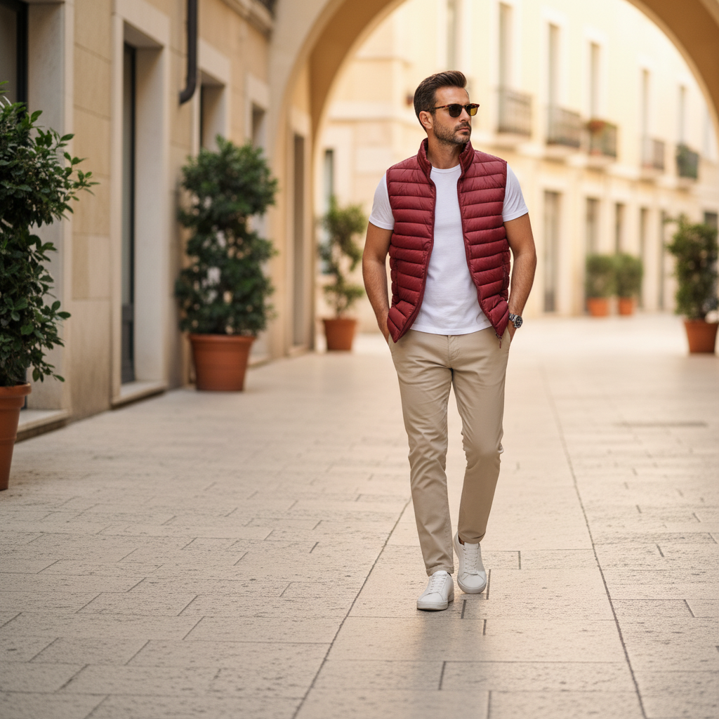 Καπιτονέ γιλέκο σε στενή γραμμή, από τεχνικό ύφασμα που απωθεί το νερό κατά την επαφή. Το ύφασμα σας βοηθά να παραμένετε στεγνοί κατά τη διάρκεια σύντομων περιόδων έκθεσης σε ελαφριά ψιλόβροχα. κόκκινο χρώμα