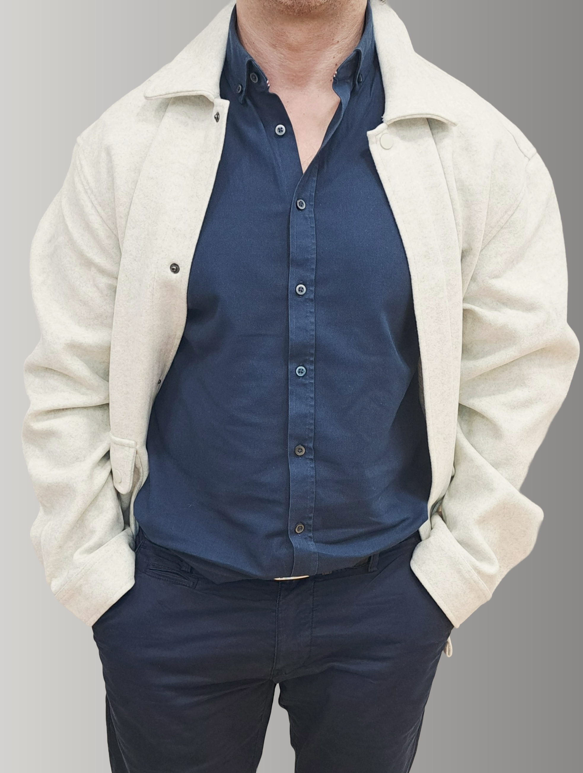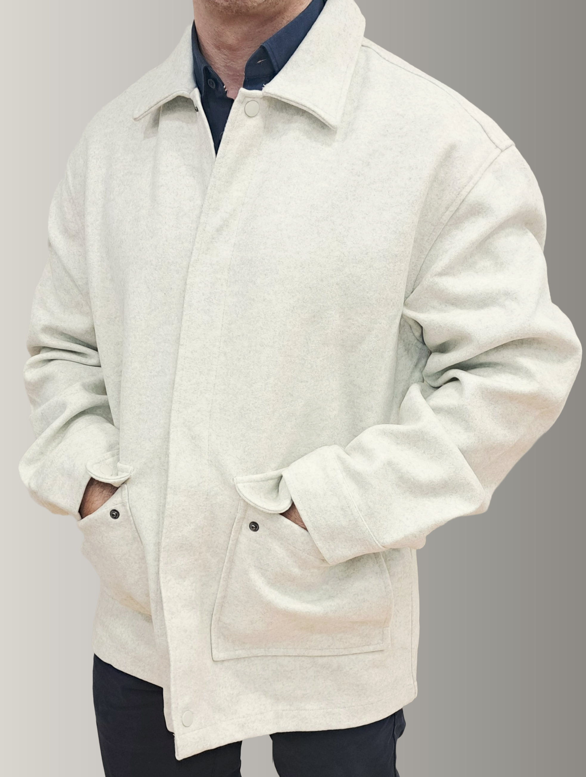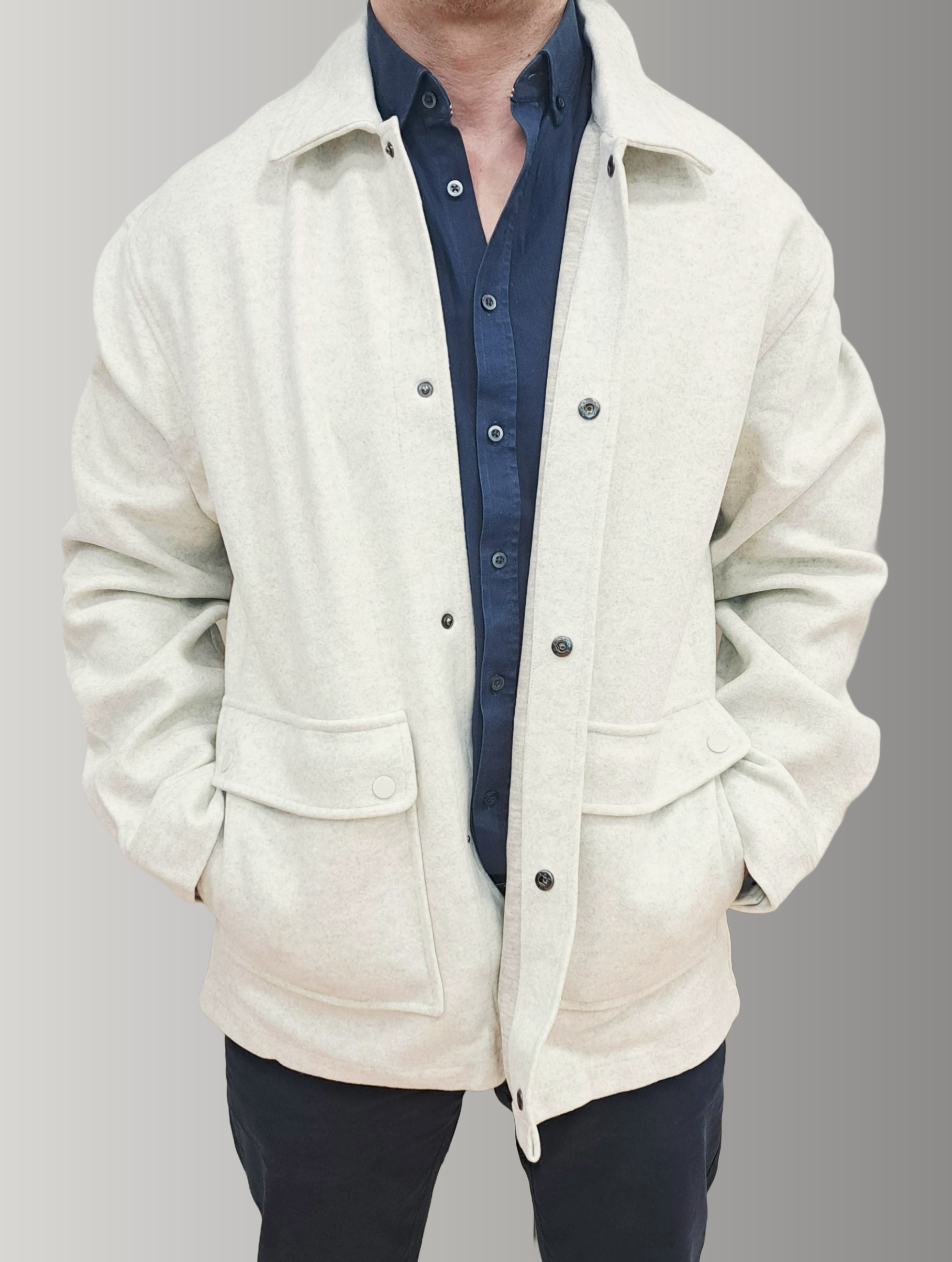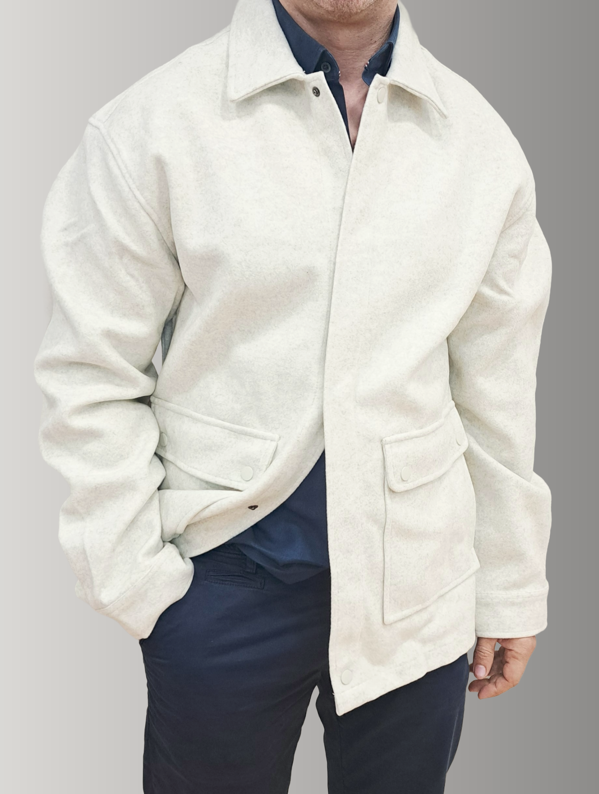 Sophisticated short coat crafted from premium blend fabric with strategic inner padding for warmth and structure. Features a refined shirt collar, extended sleeves, and a discreet buttoned placket closure that maintains clean lines. Dual side pockets provide practical functionality without compromising the tailored silhouette. The ecru tone offers versatile elegance, seamlessly transitioning from casual to polished occasions. An essential layering piece for the discerning wardrobe.