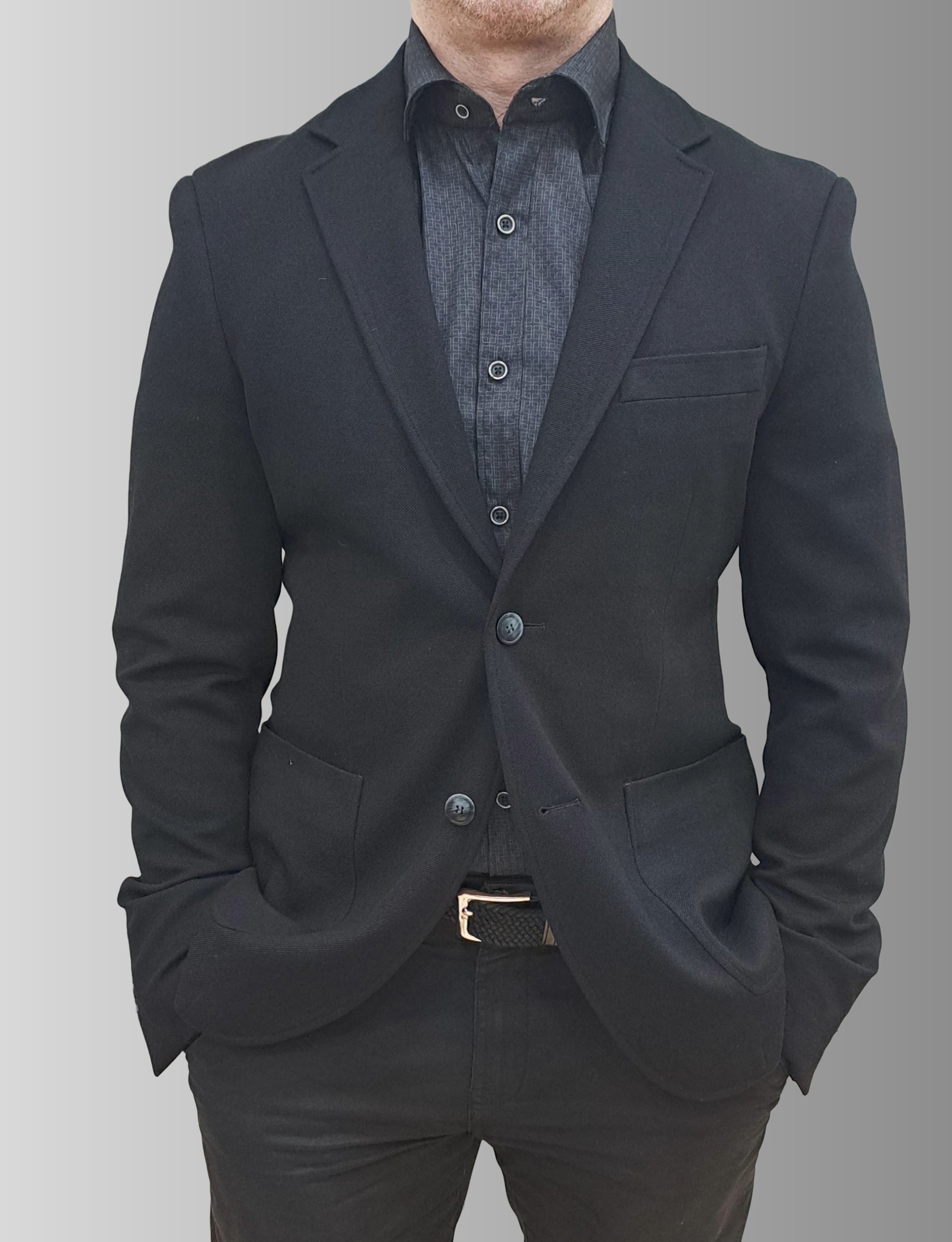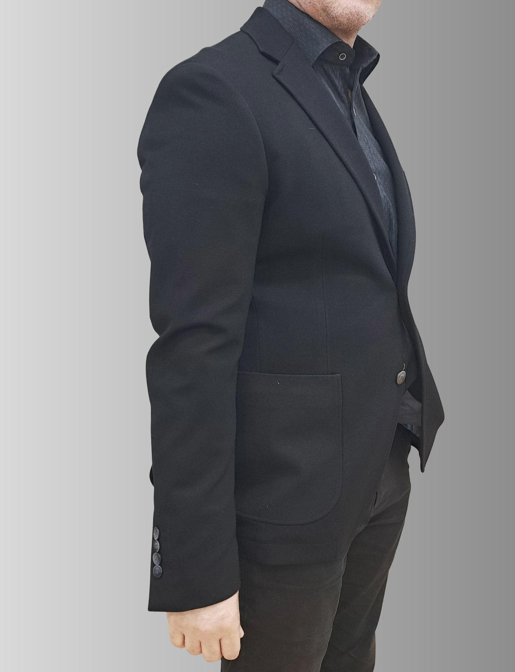 d This black blazer is cut to a relaxed fit with a more relaxed silhouette through the chest and shoulder, featuring a natural shoulder, wide notch lapels, and jetted pockets.