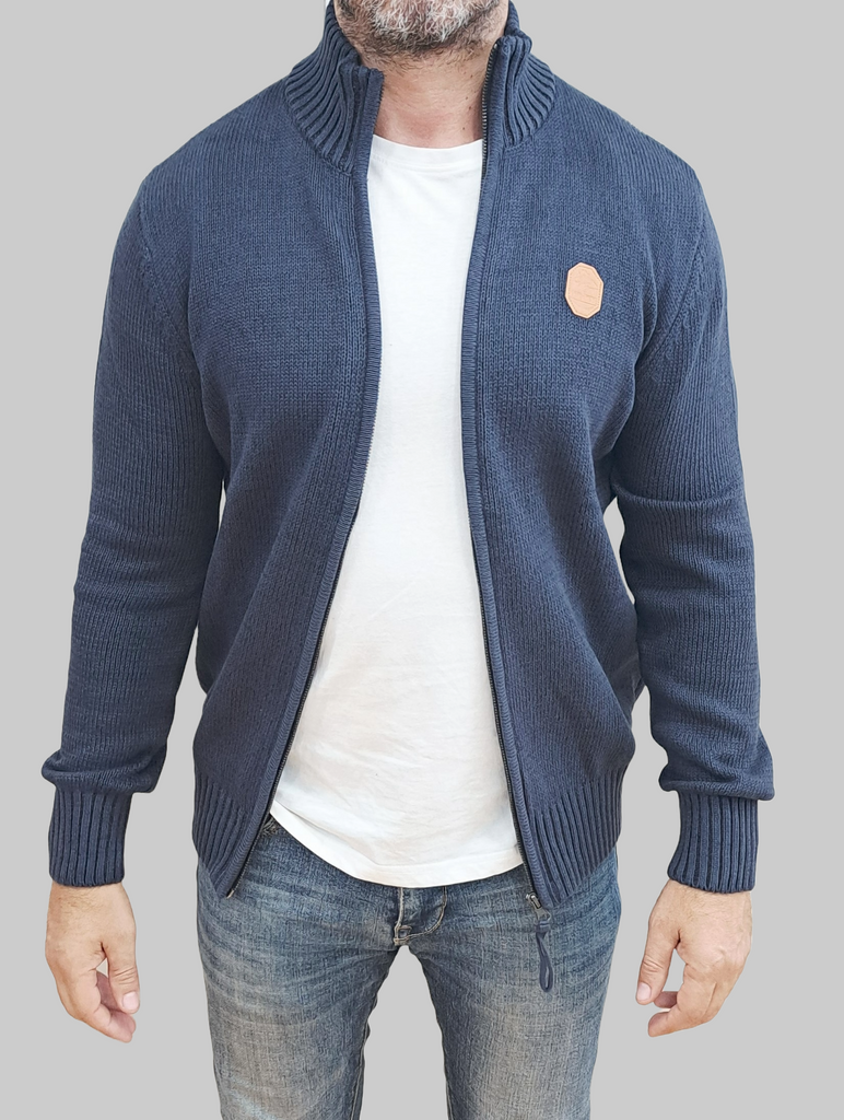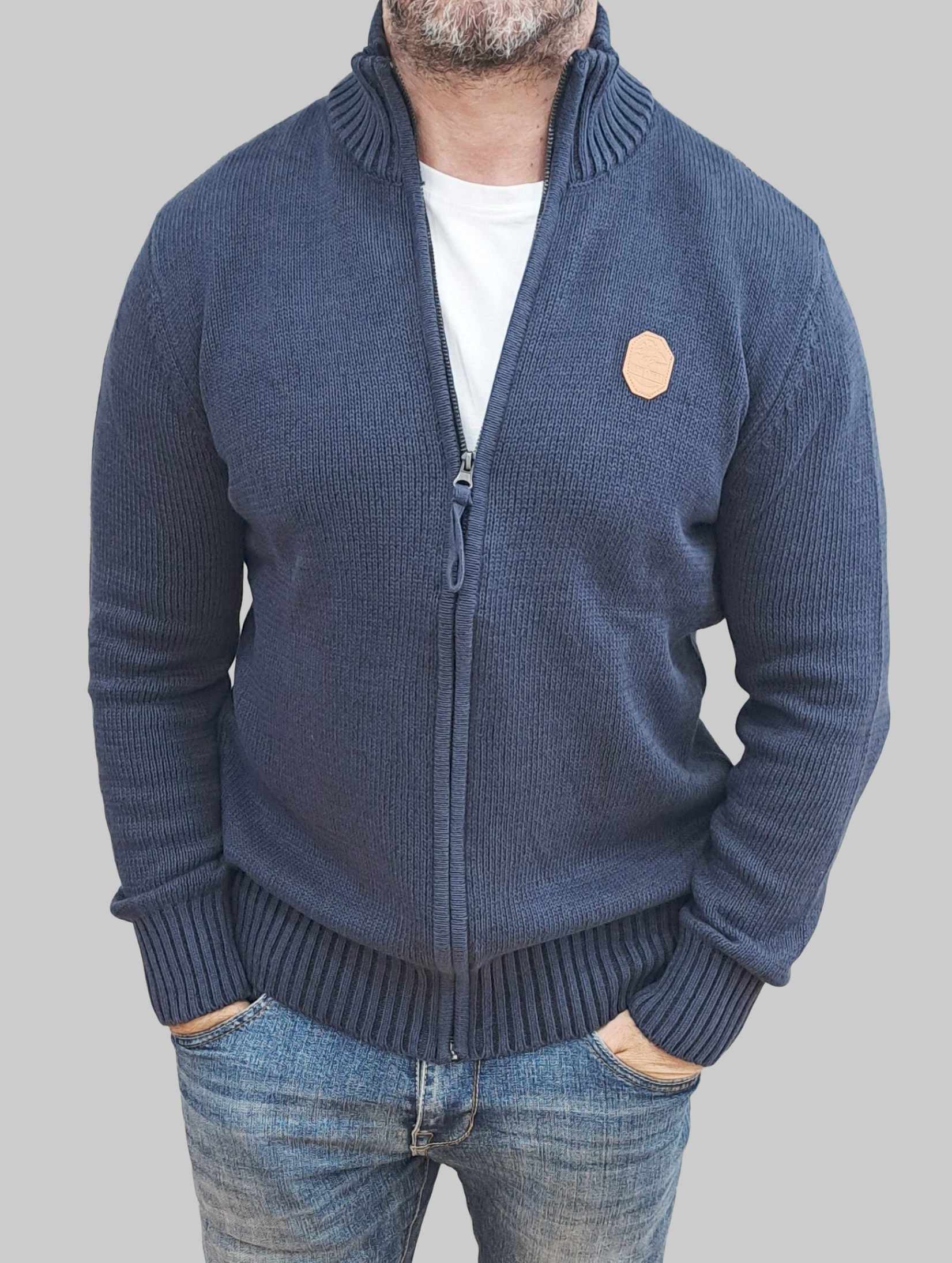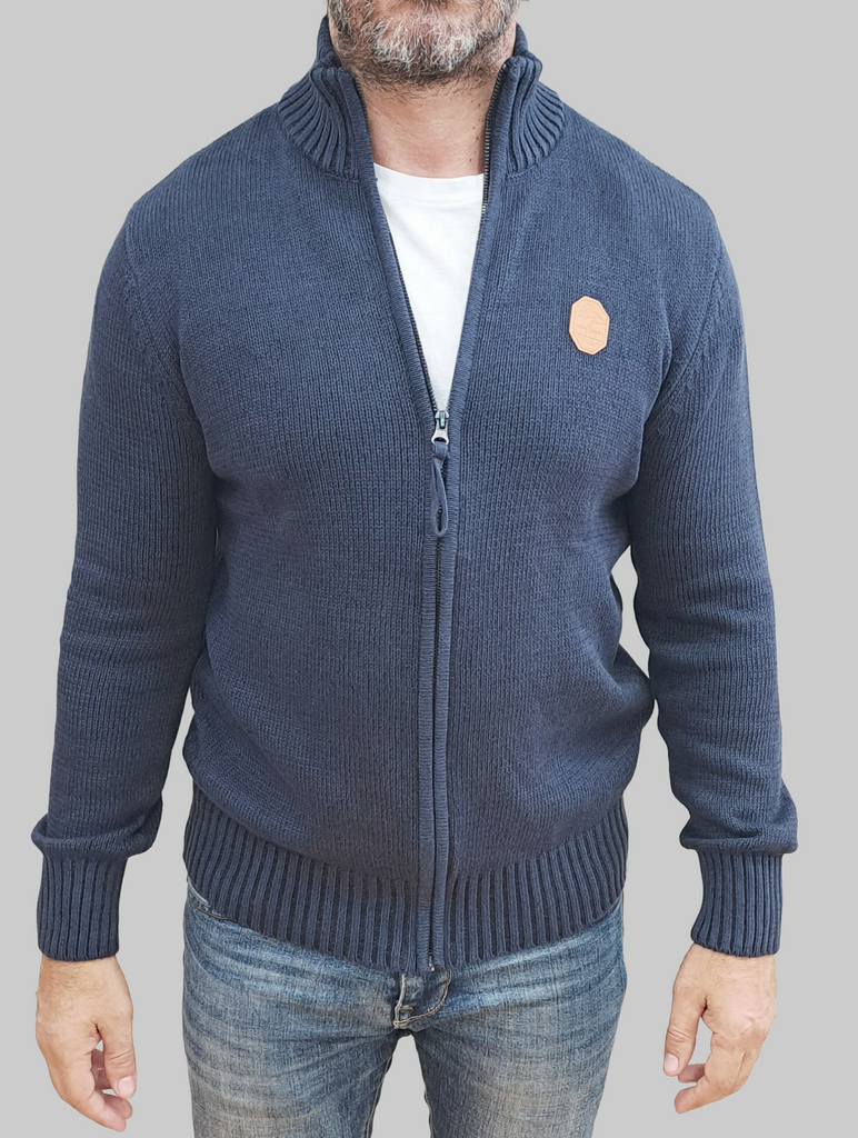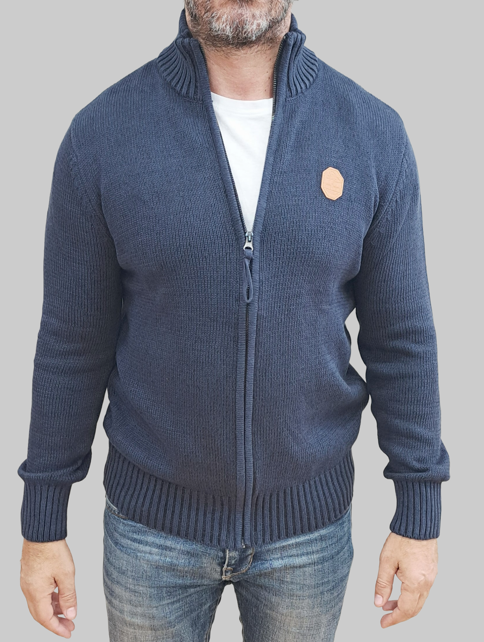 This blue Raf-colored cotton knit cardigan offers a regular fit with a high neck and long sleeves for added warmth and style. Crafted from compact cotton yarn, it features ribbed trims and a convenient zip-up front, combining comfort with practical design. Perfect for layering, it enhances your wardrobe with timeless versatility and subtle elegance.