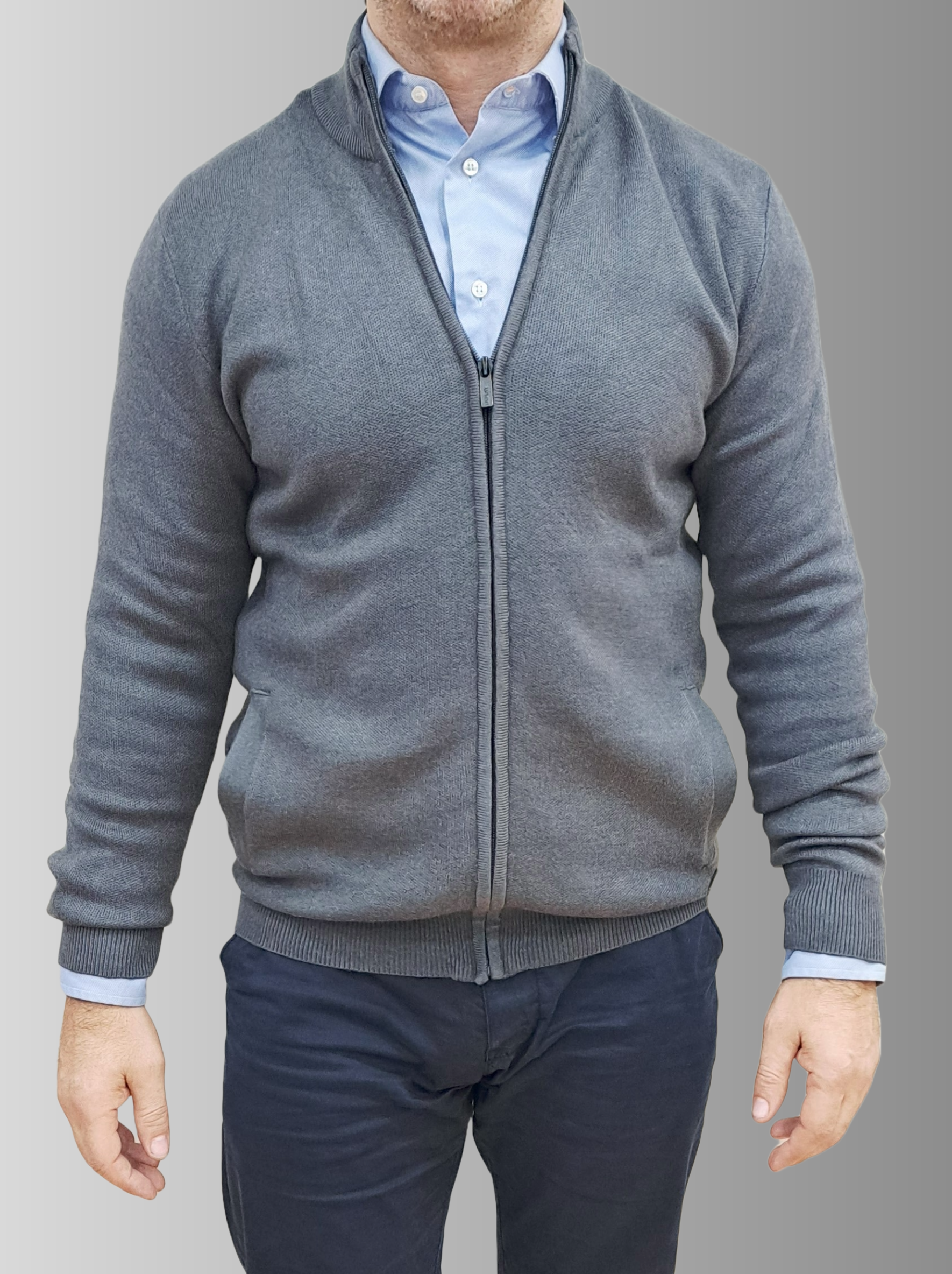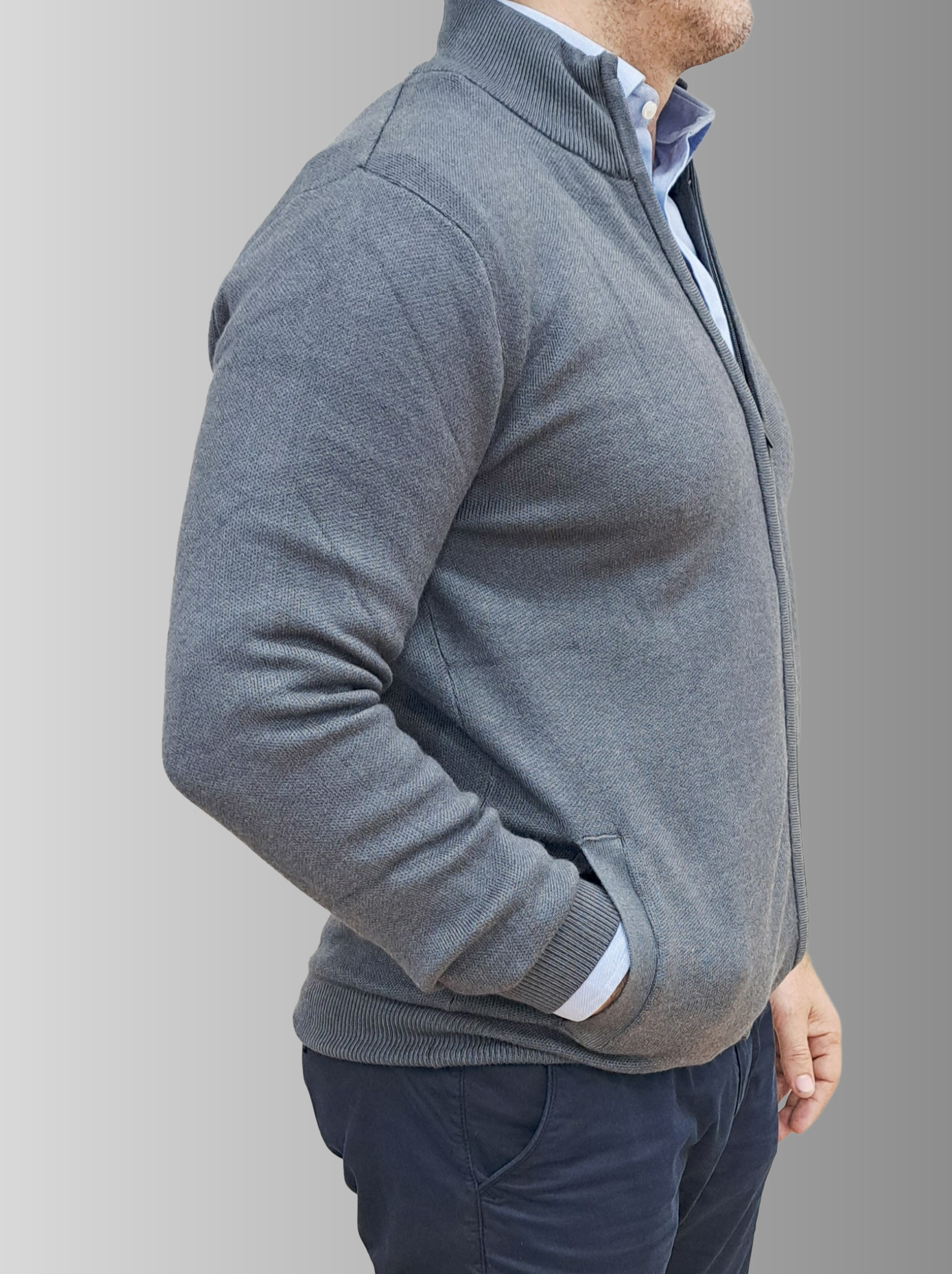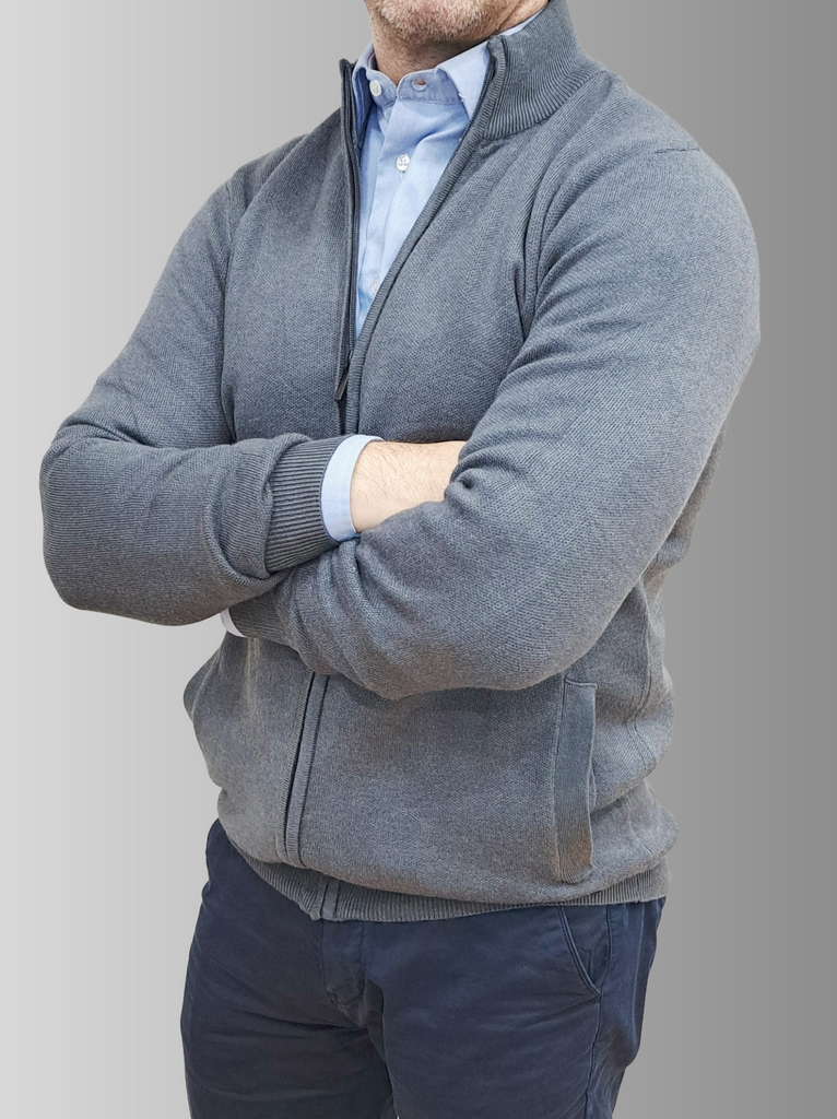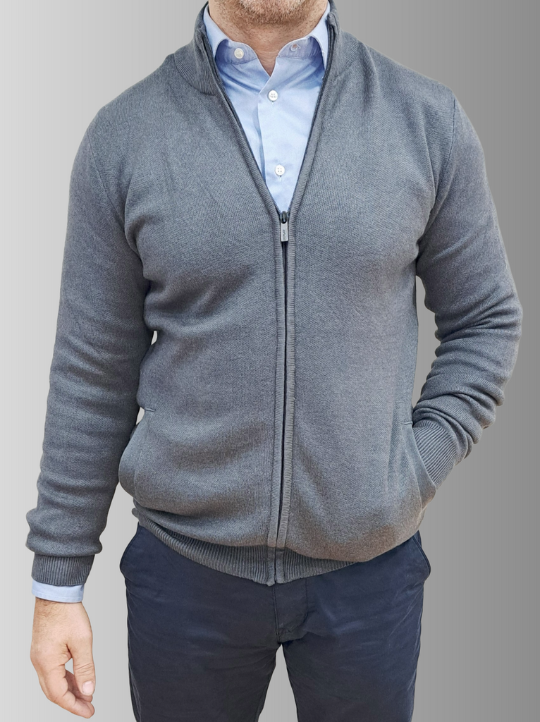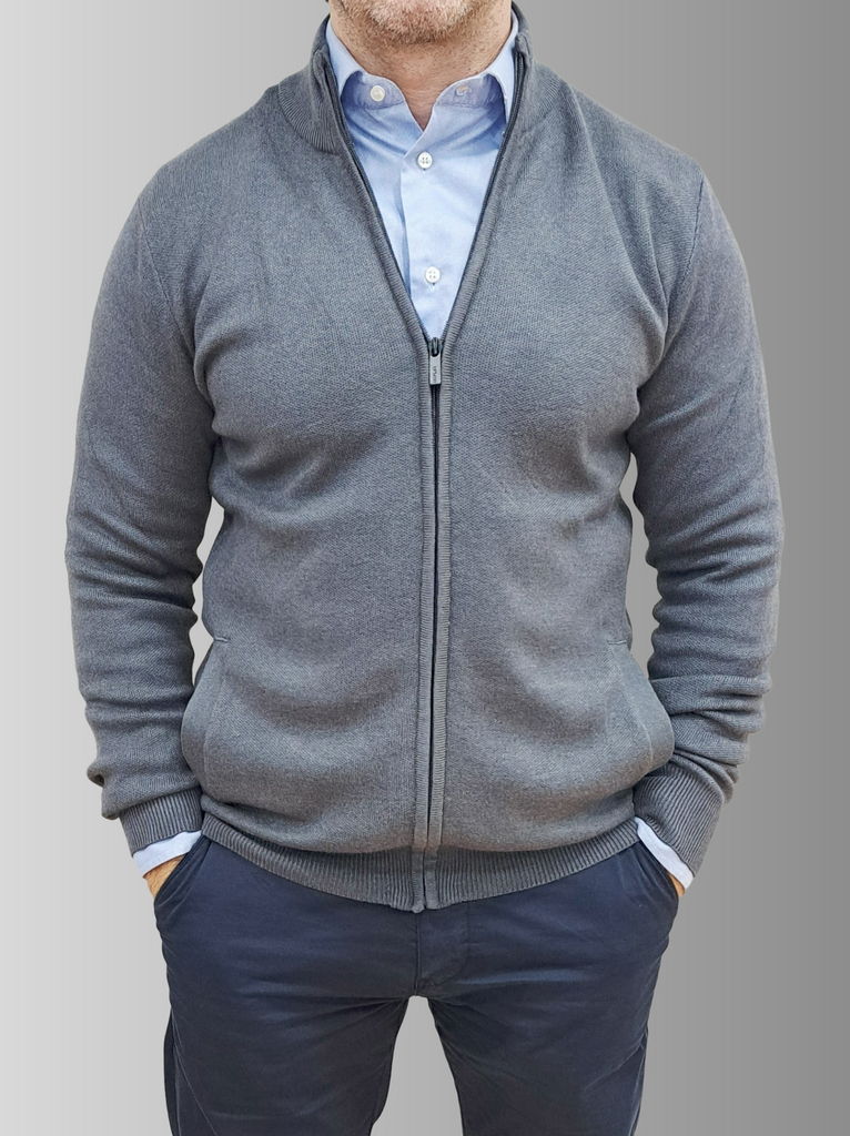 Elevate your everyday wardrobe with this versatile cotton knit cardigan. Crafted from compact knit cotton yarn, it offers a comfortable regular fit that works beautifully for any occasion. The high neckline and long sleeves provide warmth, while practical side pockets at the hip seam keep your essentials within reach. Finished with ribbed trims and a smooth zip-up front for easy layering, this grey cardigan is the perfect piece to transition seamlessly through your day.