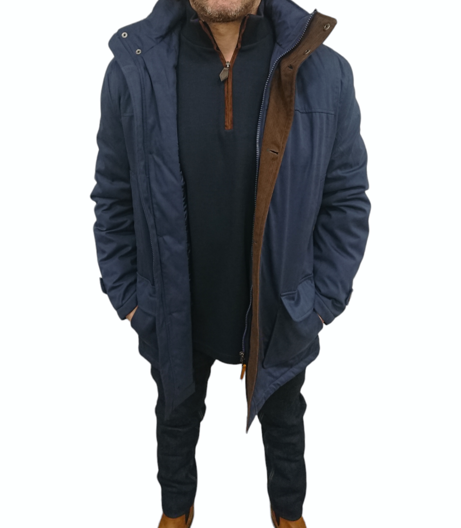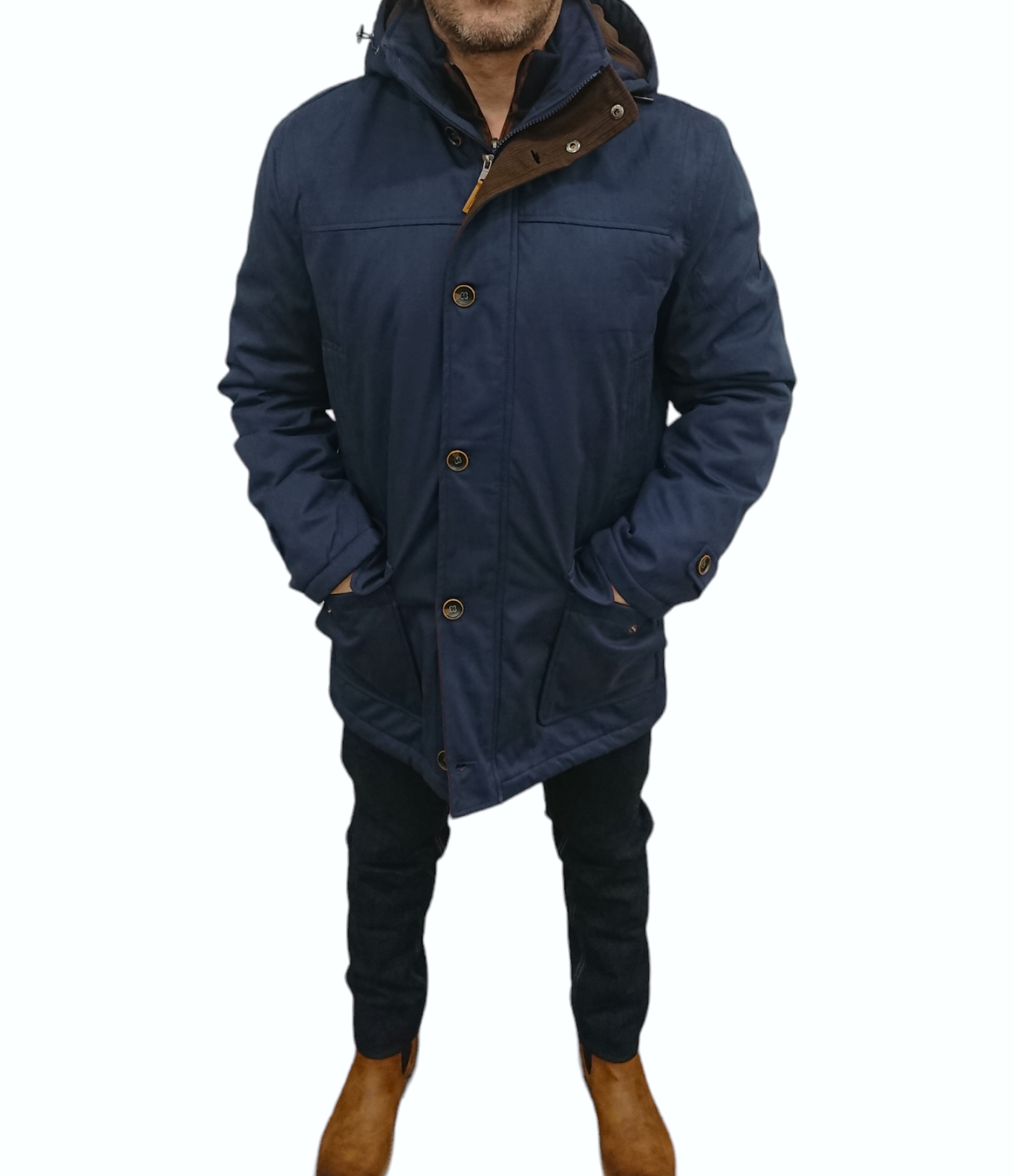 Natural down interior. BI-STRETCH Fabric: the fabric stretches both vertically and horizontally, providing great comfort. High neck with hood. Zip fastening concealed by a placket with snap buttons. Two side pockets. Two patch pockets with flaps. Stretch cuffs. Adjustable drawstring waist. Hem with back vent.blue color